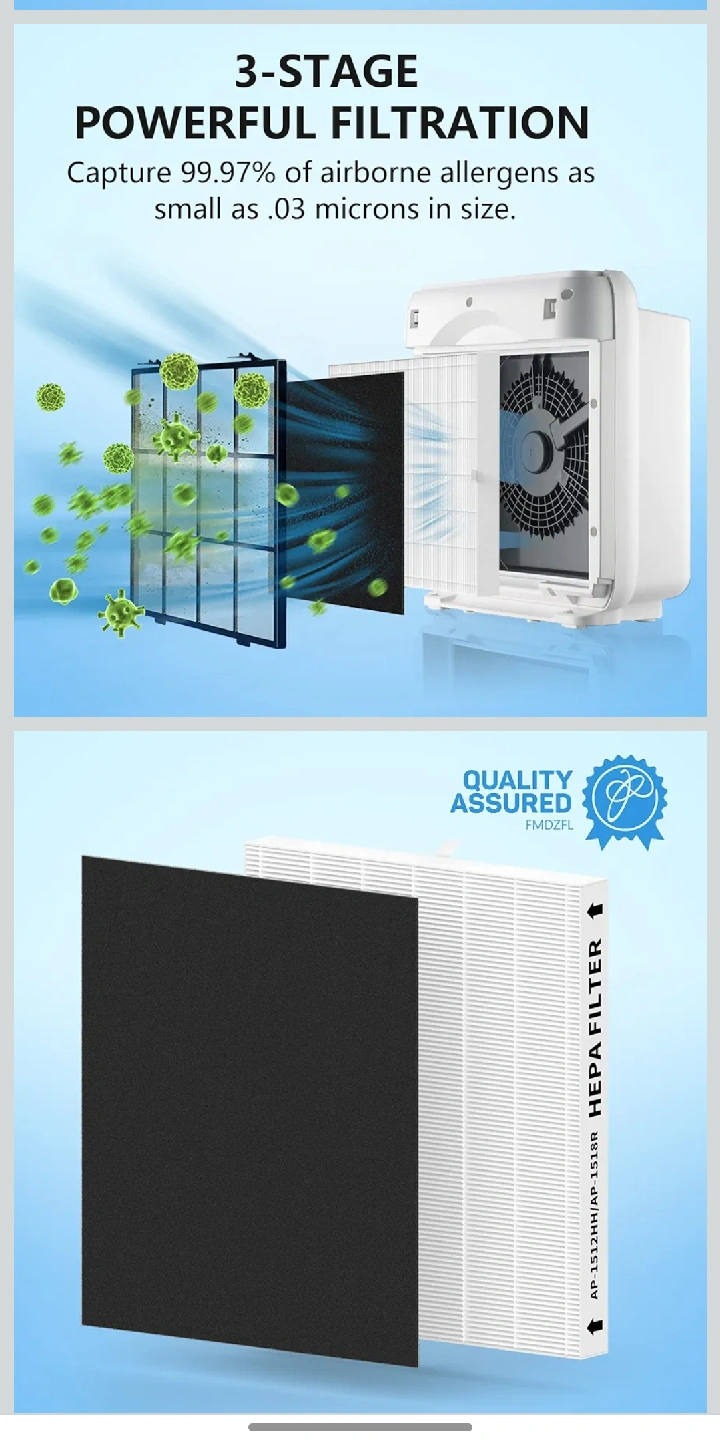 10I have a new set of Coway Airmega AP-1512HH HEPA filters for sale. These filters offer 3-stage powerful filtration, capturing 99.97% of airborne allergens as small as .03 microns in size. The dimensions are approximately 13.0 in x 15.1 in. Keep your air fresh and clean!