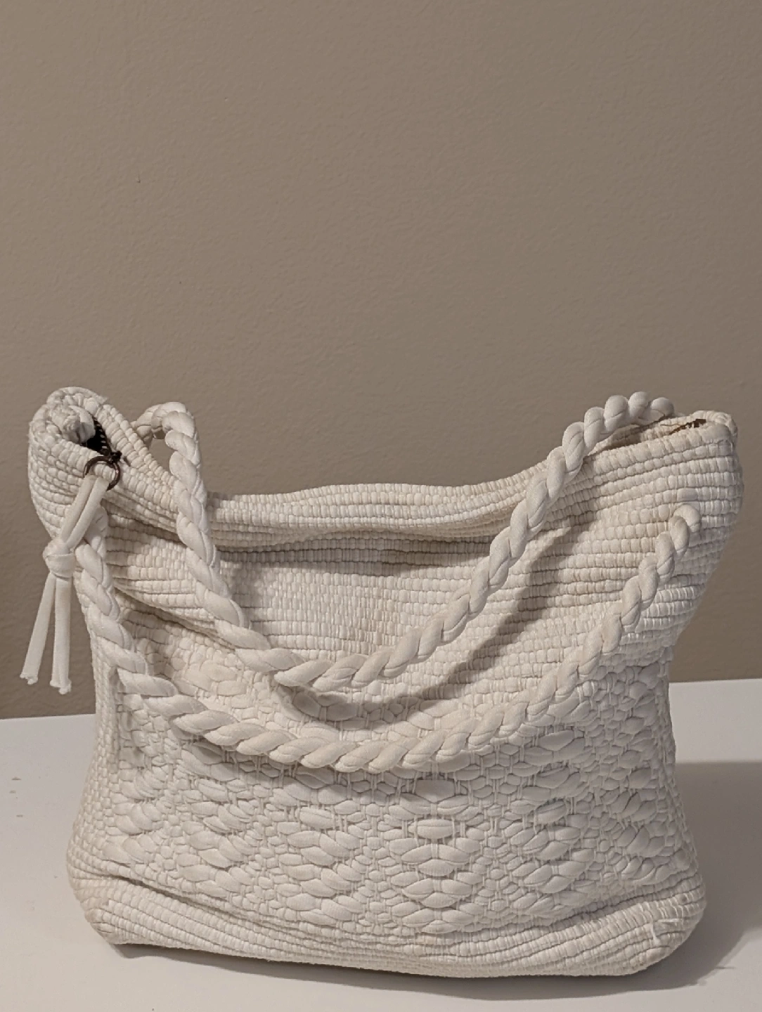 This off-white woven shoulder bag features rope detailing for a unique look. It's perfect for adding a touch of texture to your outfit. The bag is in great condition and ready for a new home