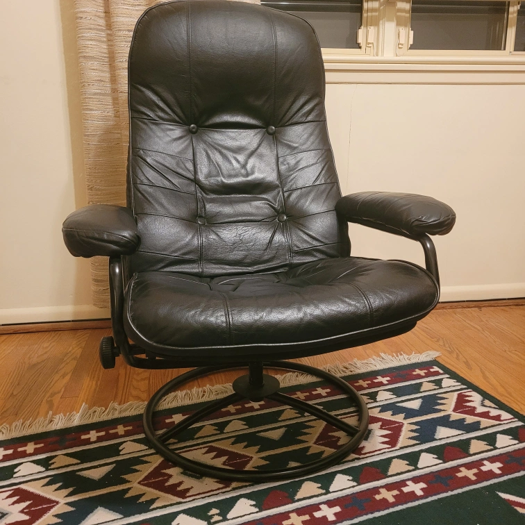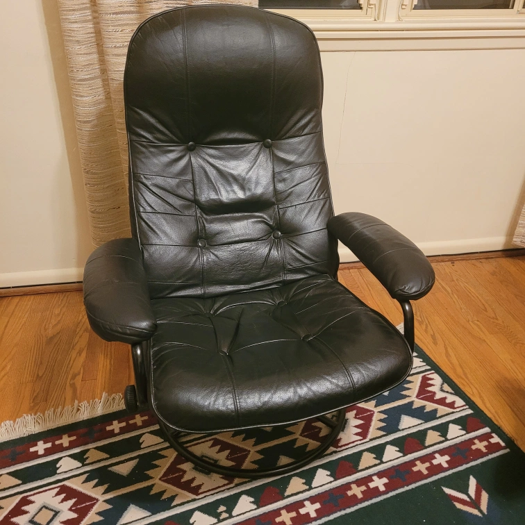 65genuine black leather swivel recliner chair! It's in excellent condition and would be perfect for a reading nook, living room or office space pick up this weekend