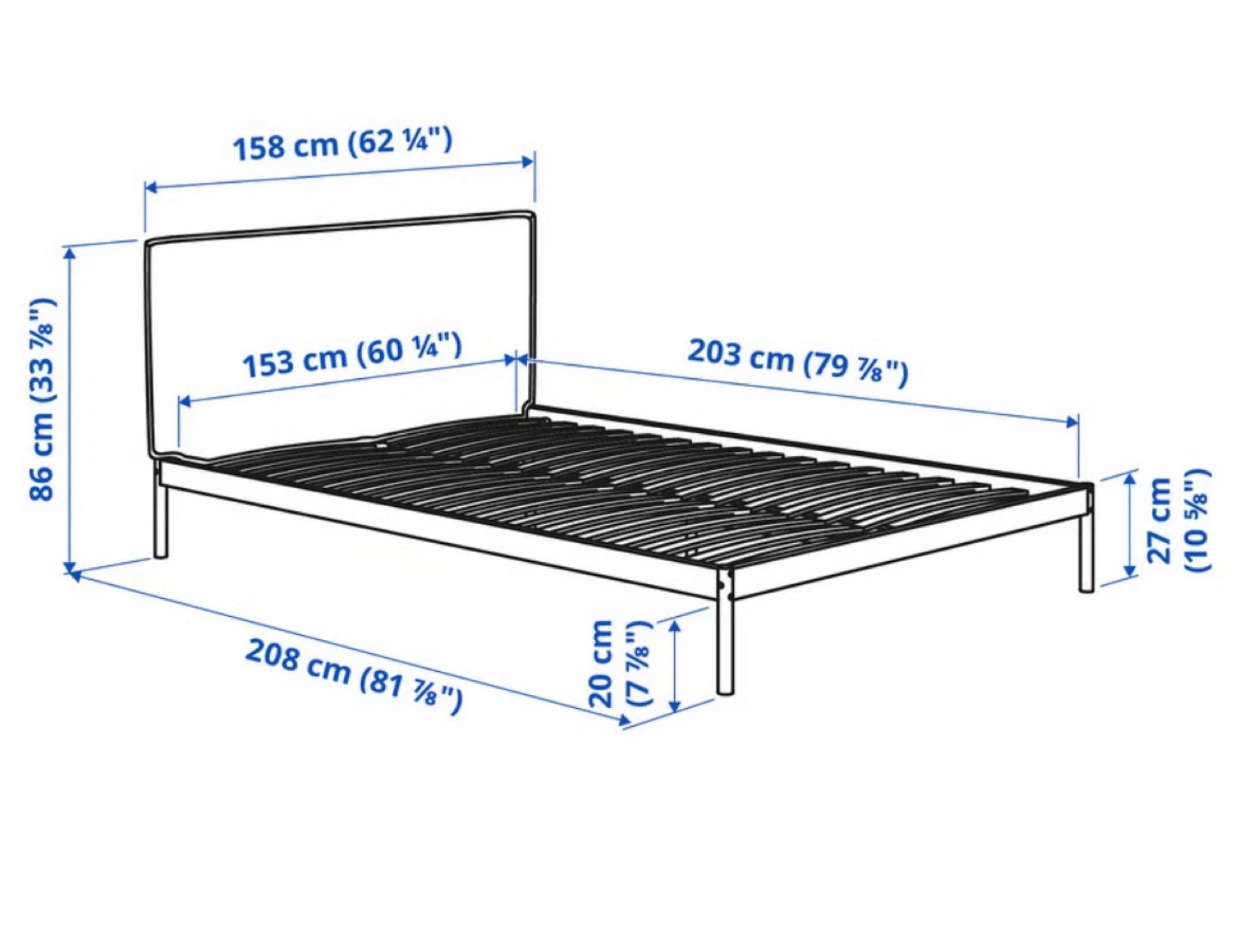 Selling a queen-sized IKEA GJÖRA bed frame! The dimensions are 208 cm (81 7/8") in length and 158 cm (62 1/4") in width. The headboard height is 86 cm (33 7/8"). It's in great shape and ready for a new home
