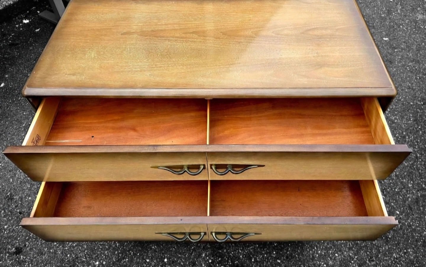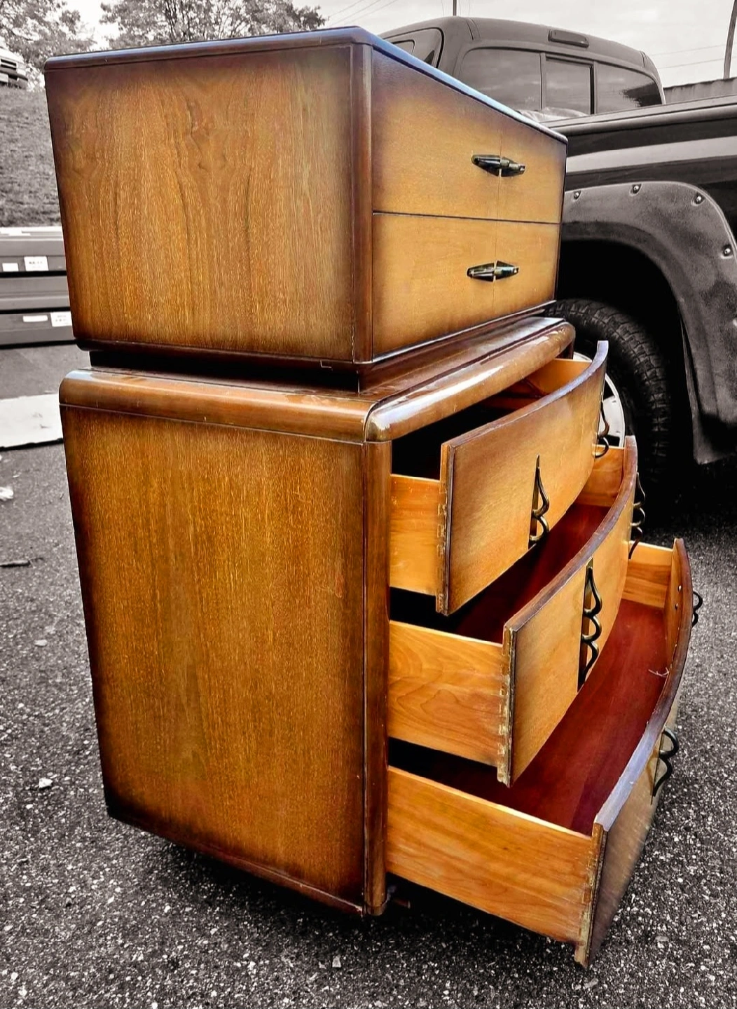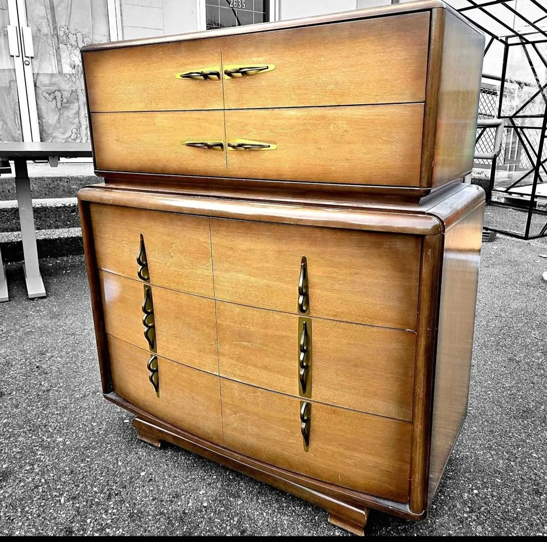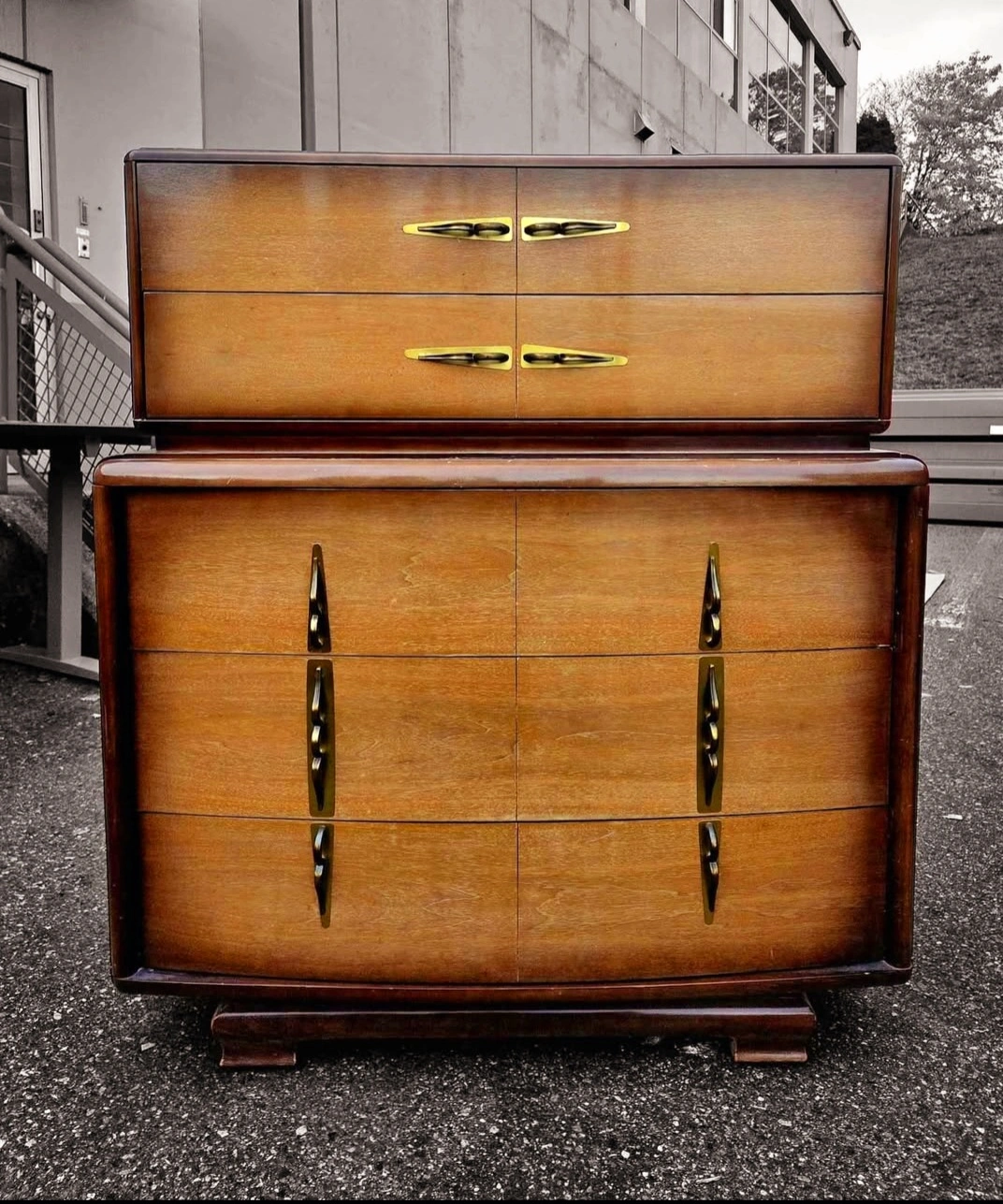 MCM Vic Art Walnut Art Deco Tallboy Dresser With Brass Accents (Delivery Available) Vintage mid century (1960s) curved tallboy dresser featured 5 drawers, original brass hardware and composed entirely of solid walnut. Dimensions: 36"(w) × 19"(d) × 48"(h) Pick up in downtown Vancouver or delivery may be arranged for a reasonable fee. Tags: retro vintage antique 1910s 1920s 1930s 1940s 1950s 1960s 1970s mcm mid century modern furniture wardrobe dresser highboy tallboy brass gold guild bedroom cabinet storage art deco convex westendtrends vanvaluevintage furniture