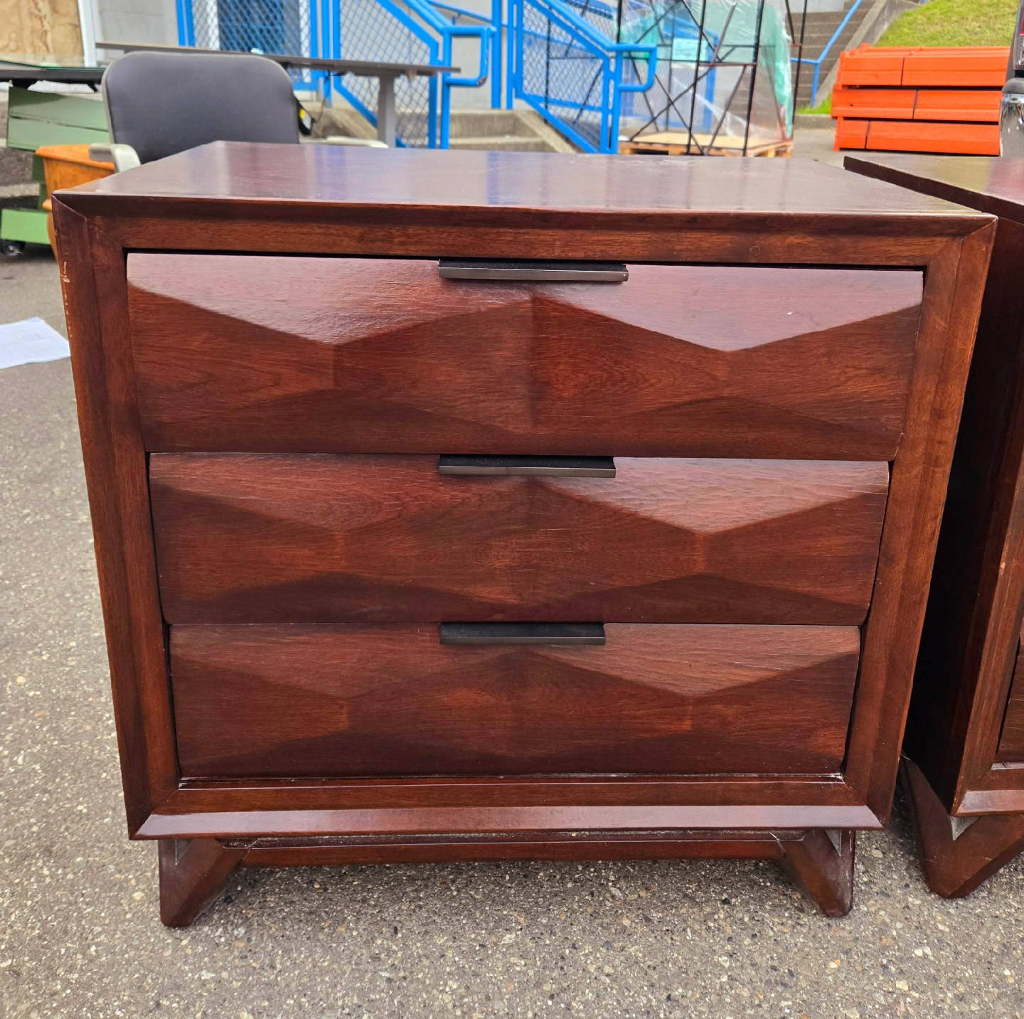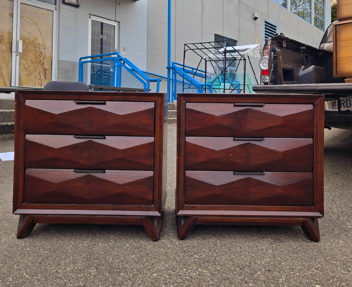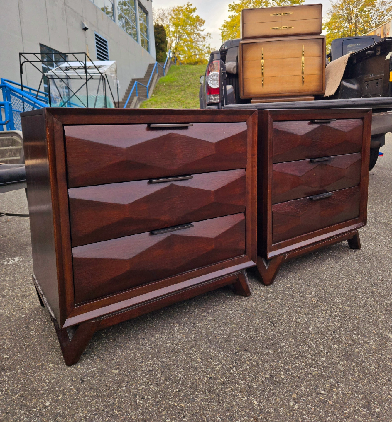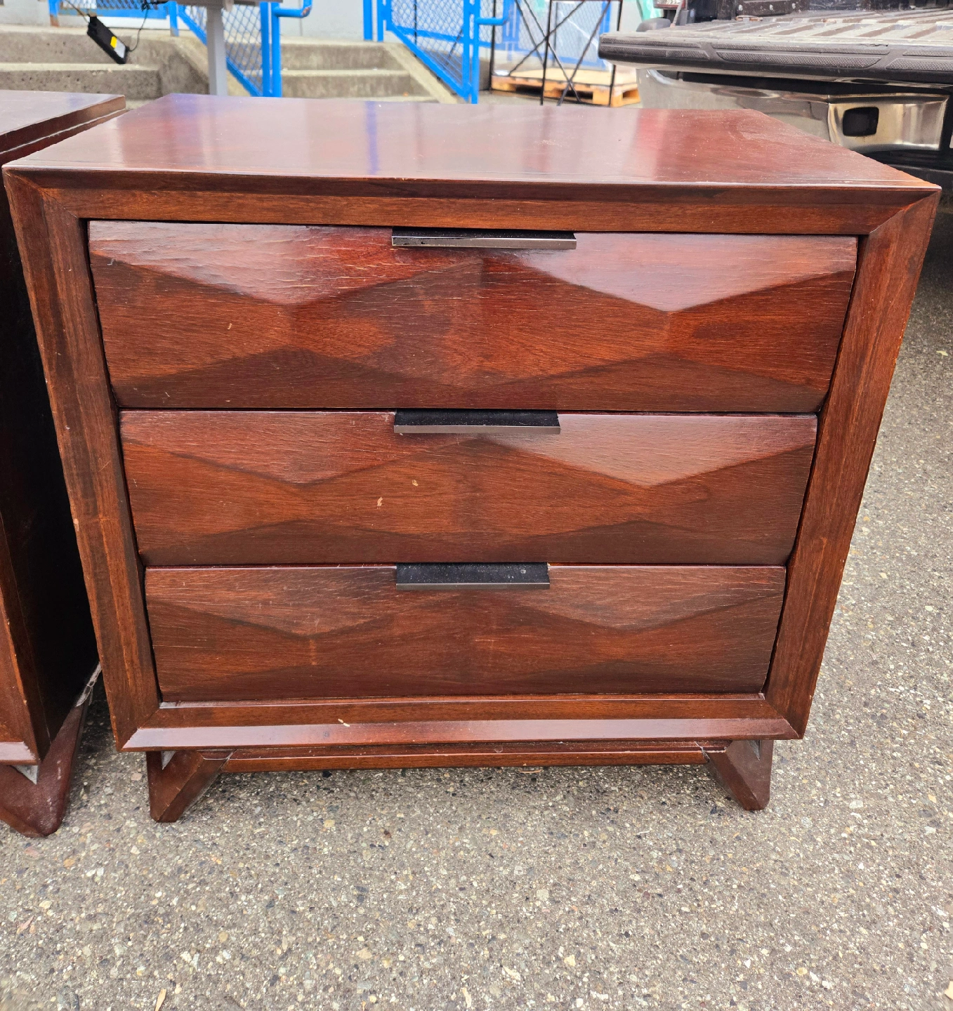 Paid Of MCM Style Solid Wood Nightstands With 3 Drawers (Price For Both) Matching pair of contemporary three drawer nightstands with geometric diamond cut design on the front. Dimensions: 29"(w) × 18"(d) × 29"(h) Pick up in downtown Vancouver or delivery may be arranged for a reasonable fee. Tags: modern Contemporary chic designer walnut rosewood mahogany cherry nightstands bedside tables side tables end tables living room bedroom wardrobe dresser cb2 eq3 west elm pottery barn crate and barrel structube article Moe's Scandesign rove concept westendtrends furniture vanvaluevintage