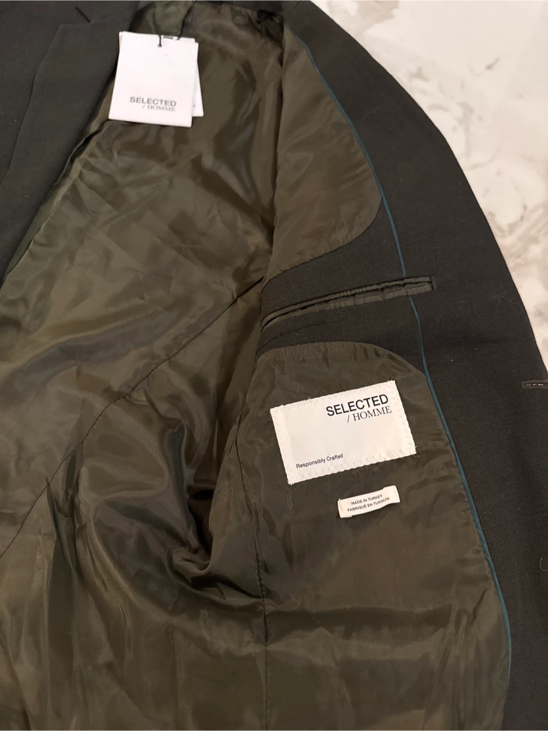 Selling a gently used dark olive blazer from SELECTED HOMME. It's a size 40R and in great condition. The blazer is a slim fit and responsibly crafted. Perfect for dressing up or down!