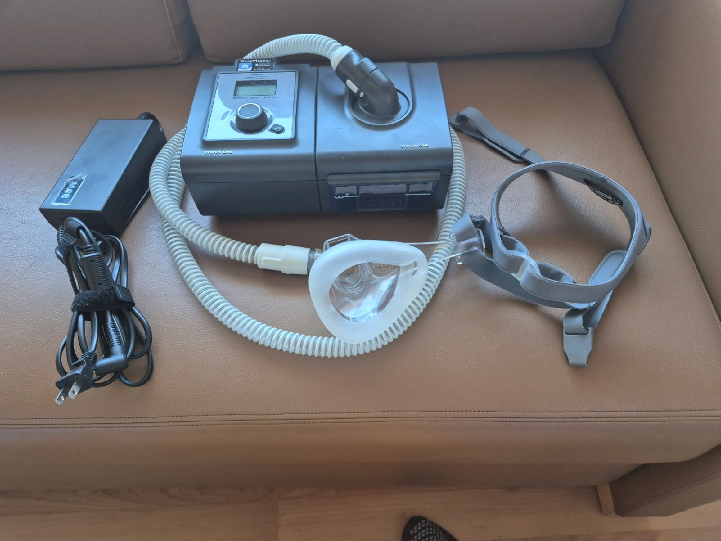 Selling a CPAP machine. It comes with all the components you see in the picture, including the mask, hose, power supply, and headgear. It's in good working condition and ready to help you get a good night's sleep!