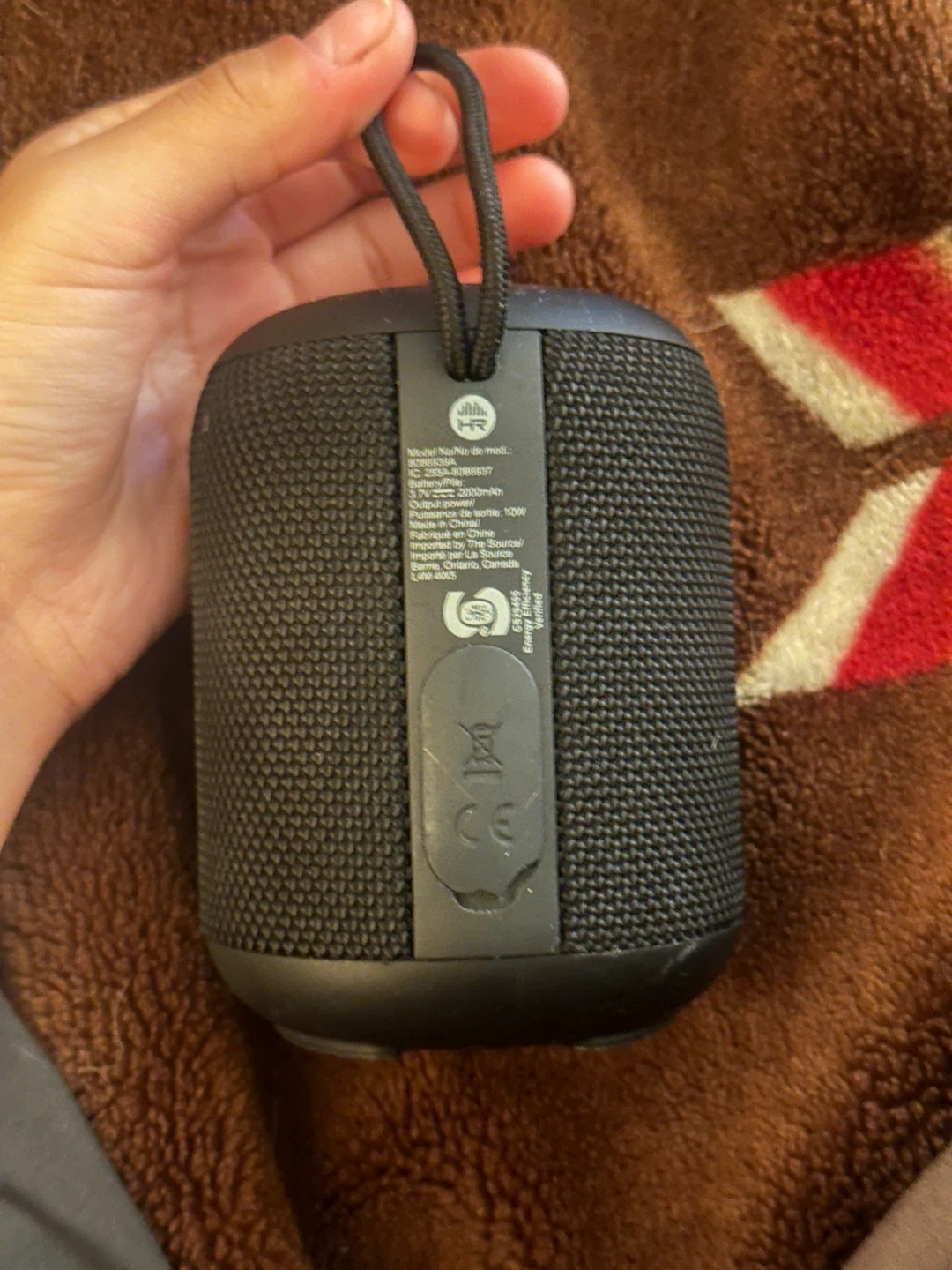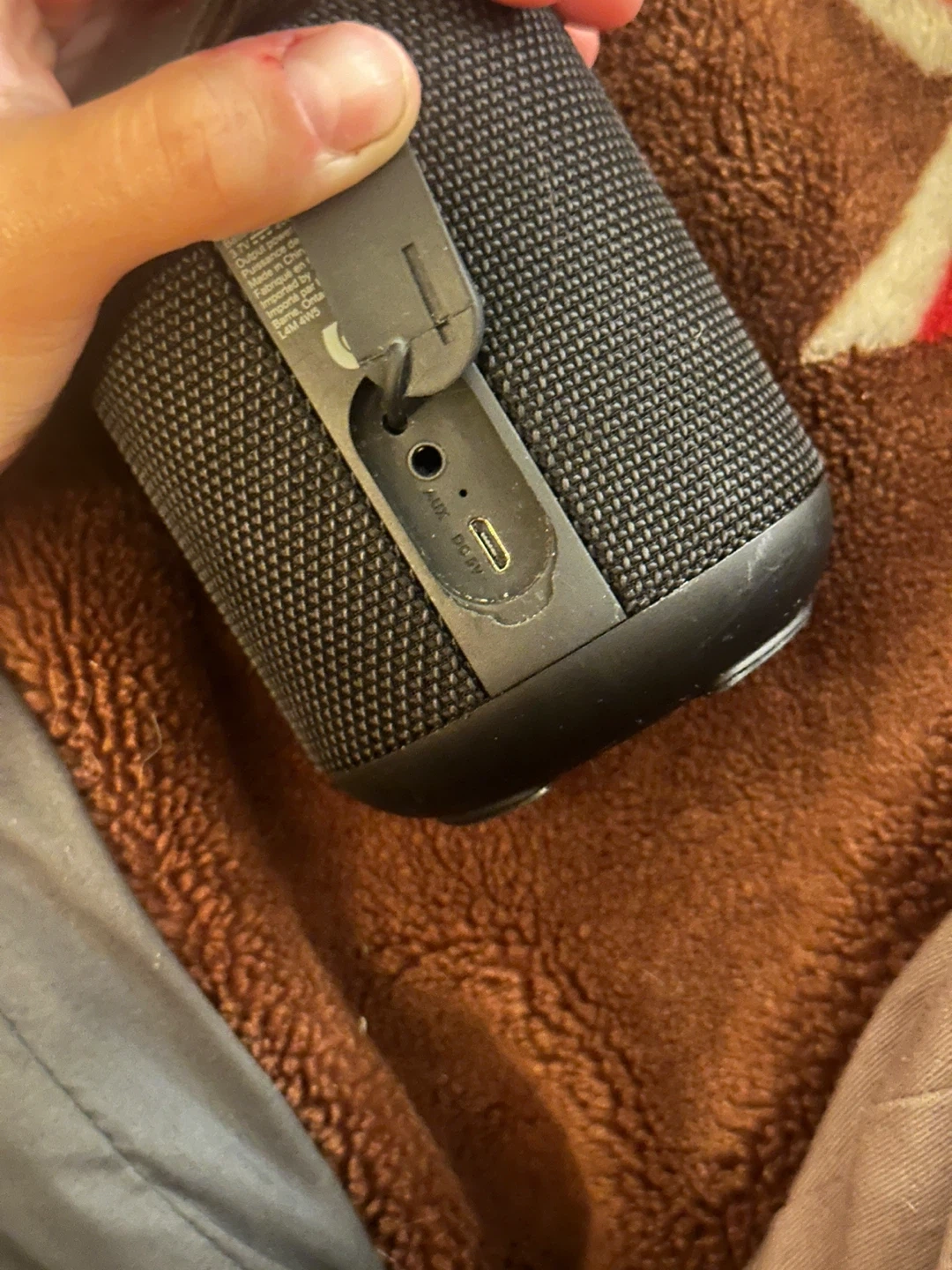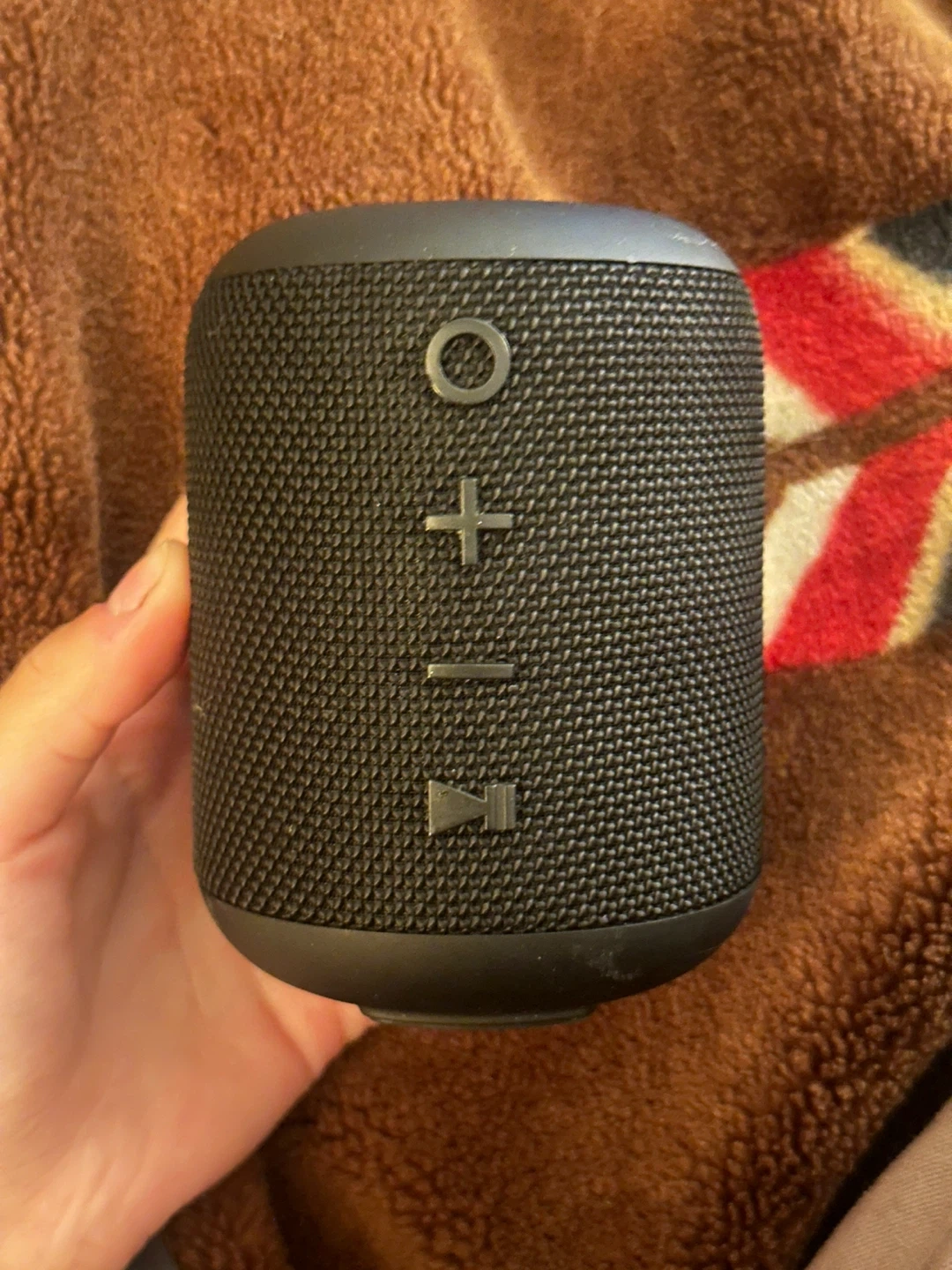 Selling a portable black Bluetooth speaker! It has a textured surface and a convenient loop for carrying around. It’s waterproof and It has buttons for volume and play/pause, as well as ports for AUX and DC 5V charging. Great for on-the-go tunes! Is in good condition but works perfectly fine.