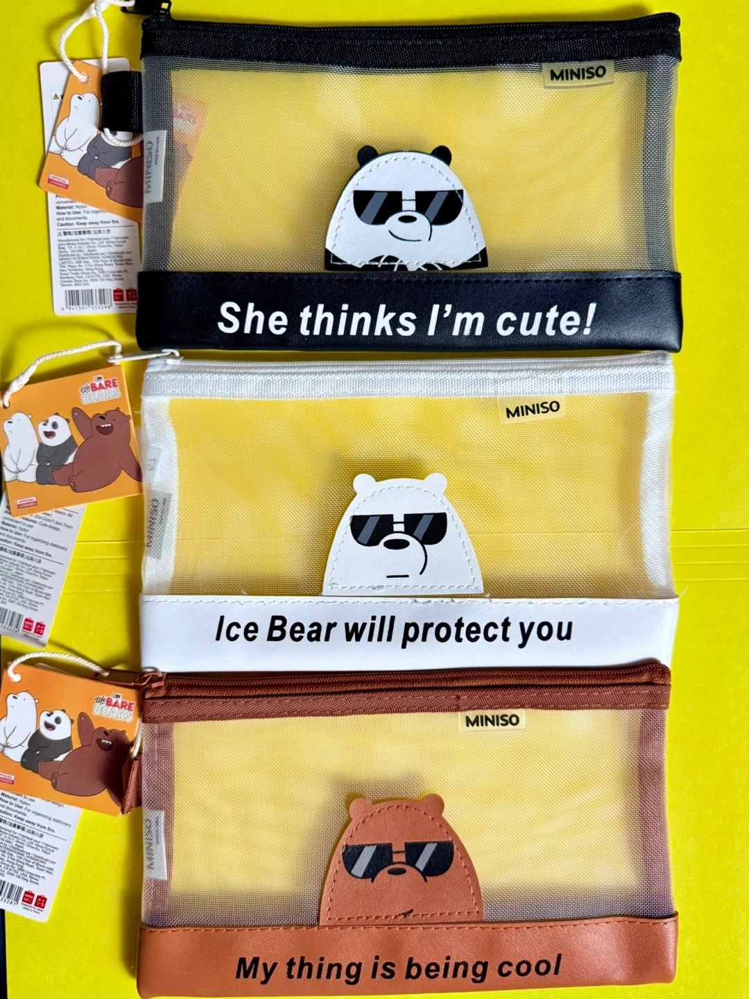 Here's a set of three adorable Miniso pencil bags featuring the We Bare Bears! Each case has a different bear design: Panda, Ice Bear, and Grizzly. They're perfect for organizing your stationery or small items. Each one has a cute saying too! The bag is great for storing pens, pencils, craft items and more stationery.