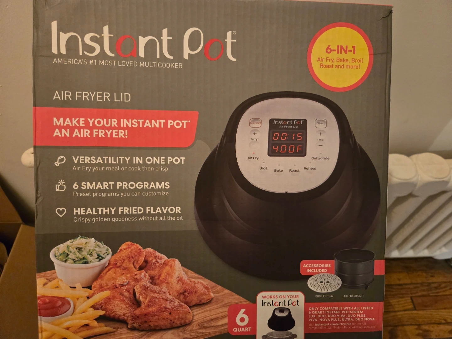 This Instant Pot Air Fryer Lid turns your 6-quart multicooker into an air fryer. It offers 6-in-1 versatility with smart programs for Air Fry, Broil, Bake, Roast, Reheat, and Dehydrate. Crispy golden goodness is achievable without all the oil!