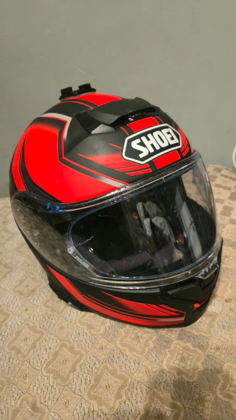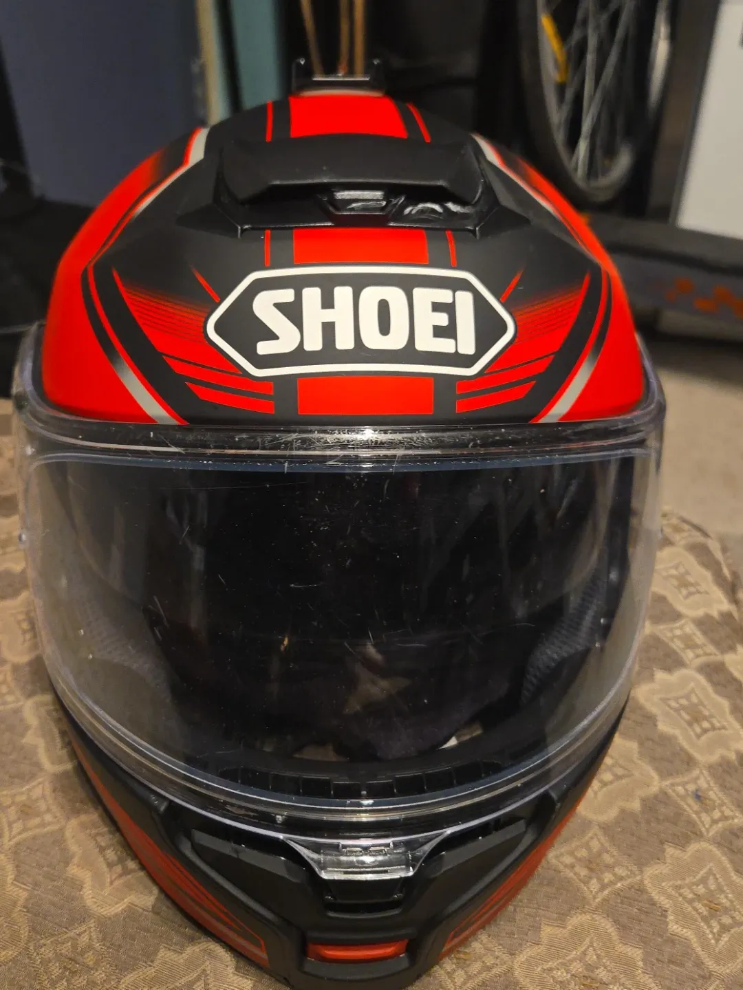 Full-face Shoei motorcycle helmet in a red and black colourway. It features a clear visor and a secure chin strap. This helmet offers excellent protection for riders.