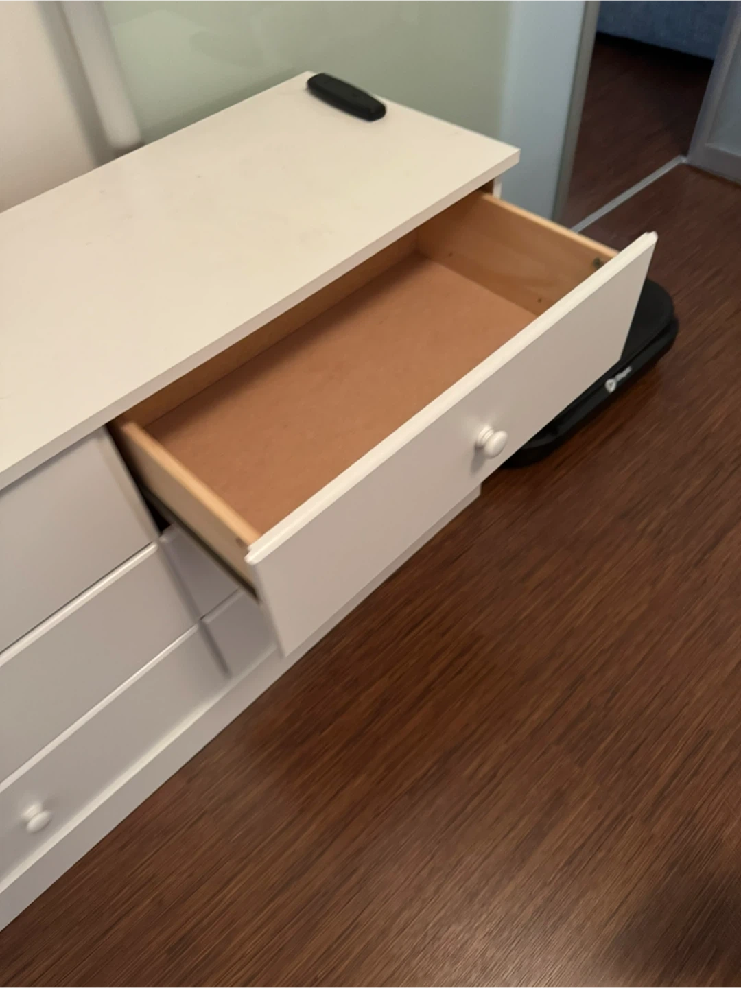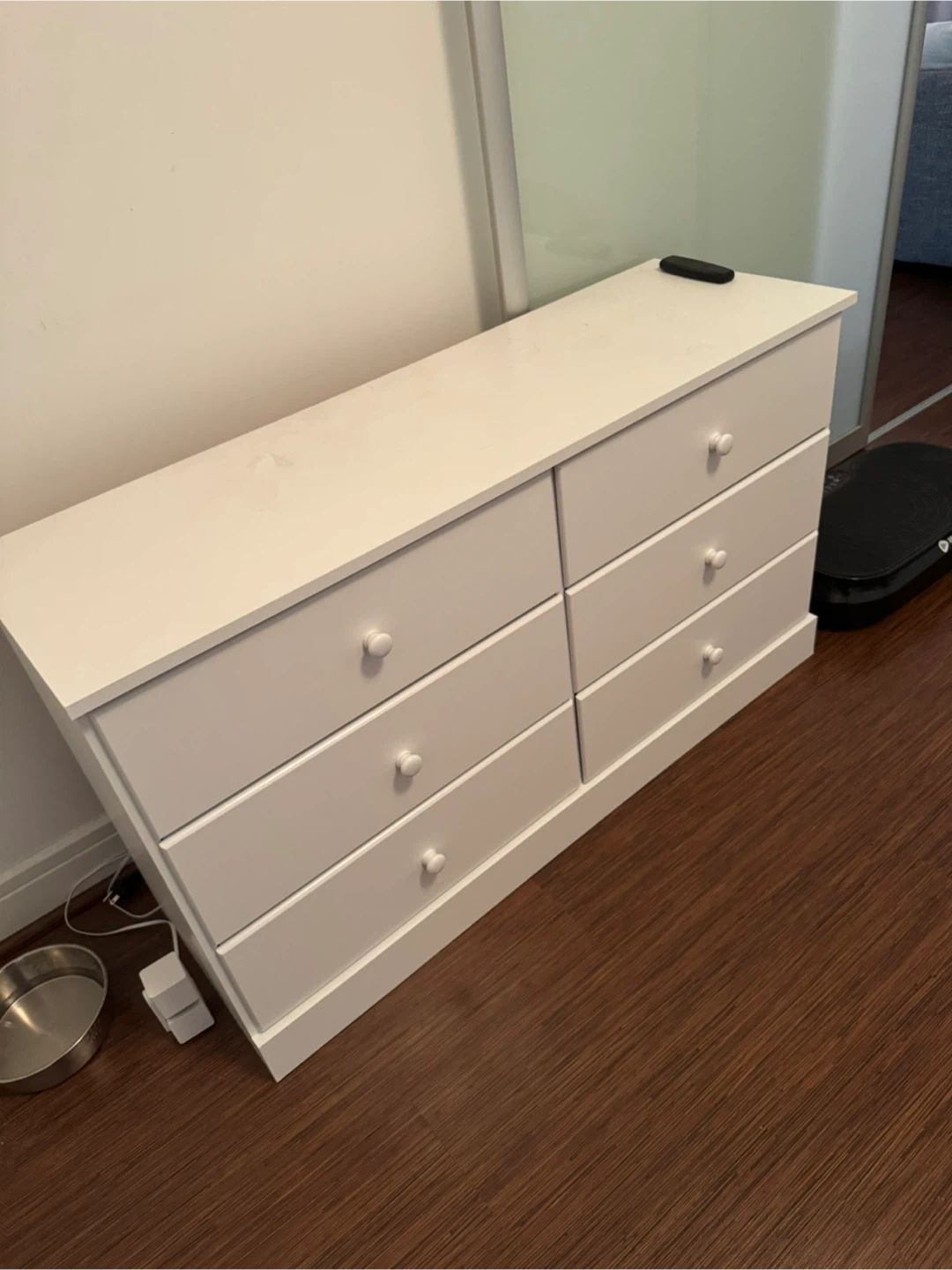 A white dresser with six drawers for storage. Made of wood. Drawers slide smoothly. Very good condition.