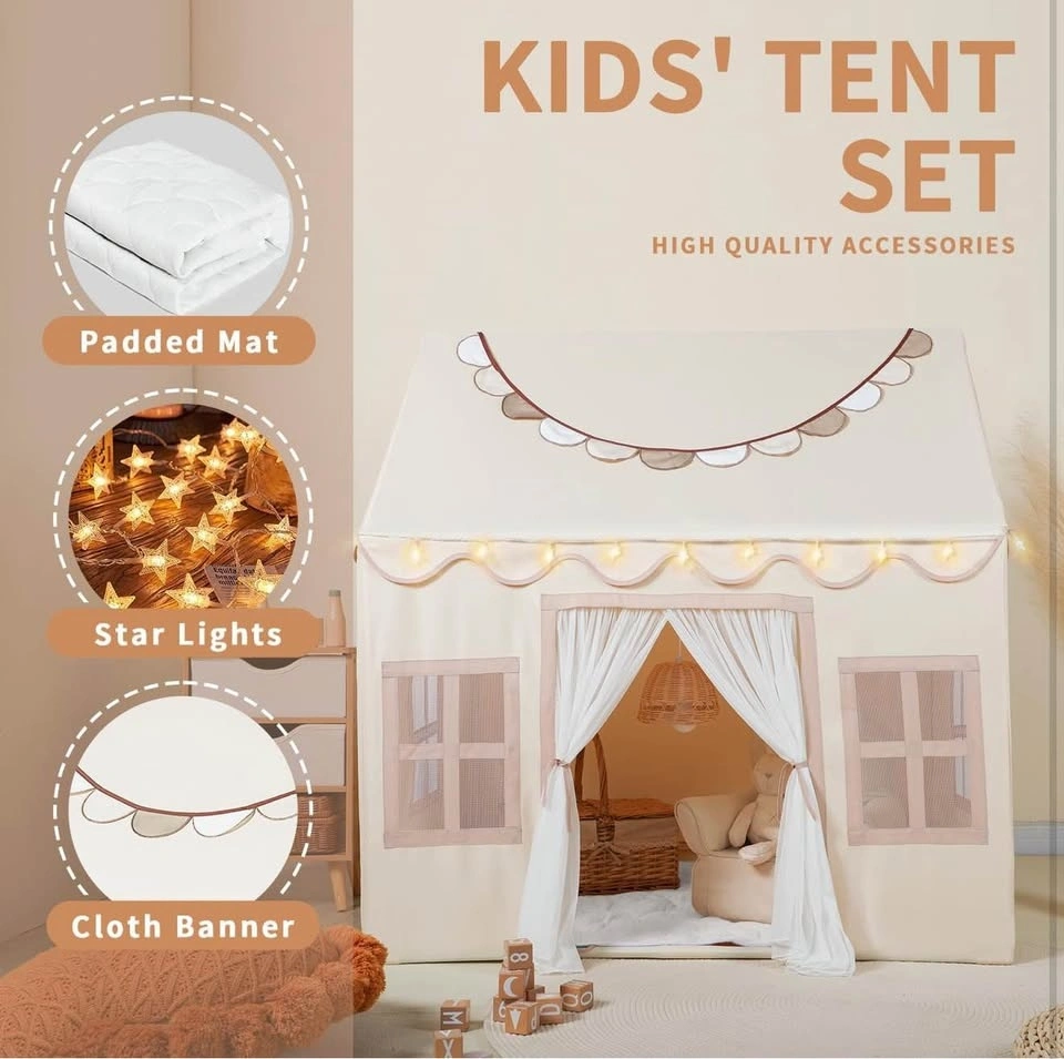 Wilwolfer Kids Tent with Mat, Star Lights, Banner -Tent for Kids Indoor Playhouse Toddler Tent Kids Play Tent for Ages 4-8 Girls Play Tent Playroom Furnitures