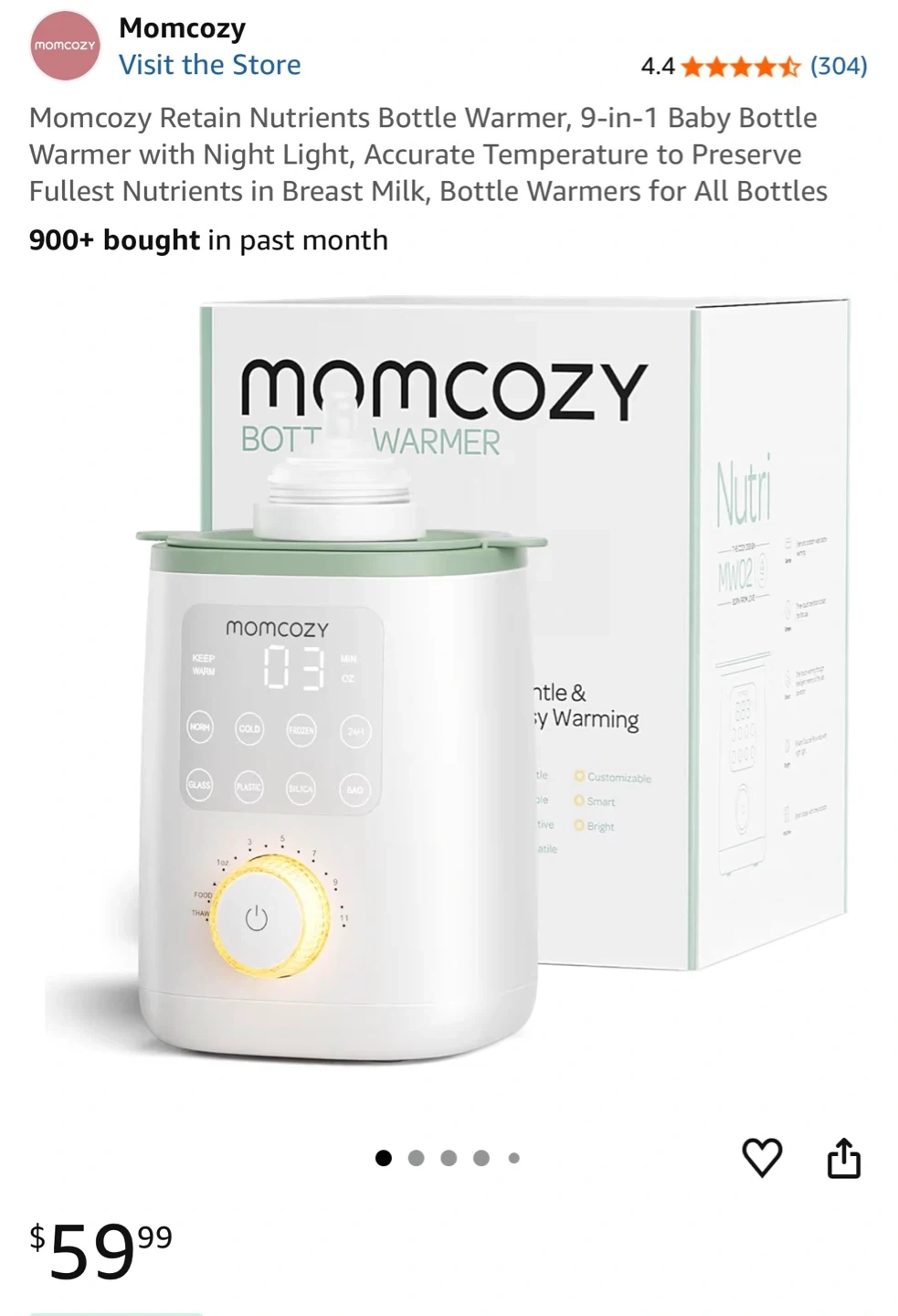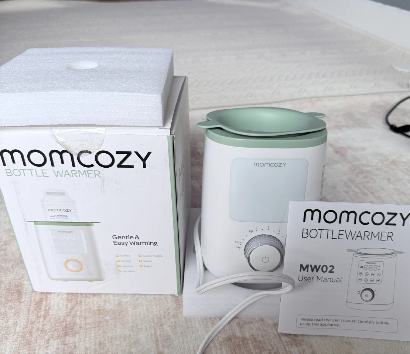 Momcozy bottle warmer for gentle and easy warming. It has functions for warming, keeping warm, and defrosting. Includes the original box and user manual.