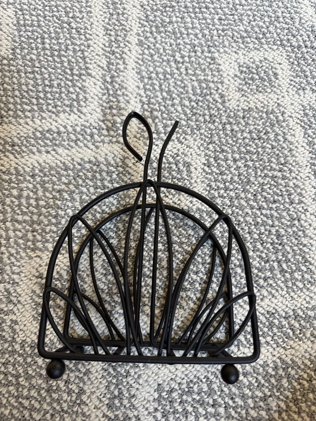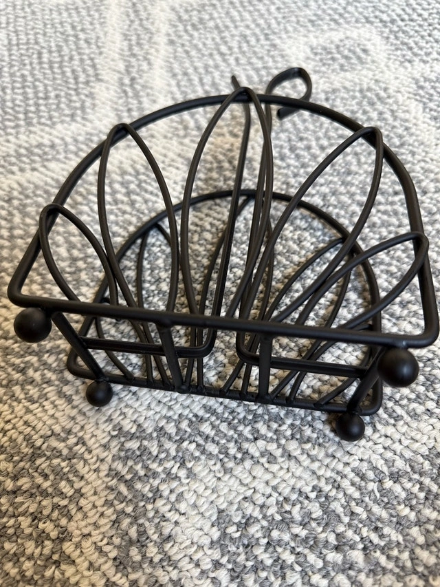 Organize your napkins with this stylish black metal napkin holder. This decorative piece keeps your napkins neatly in place, adding a touch of elegance to any table setting. This item is in good, used condition.