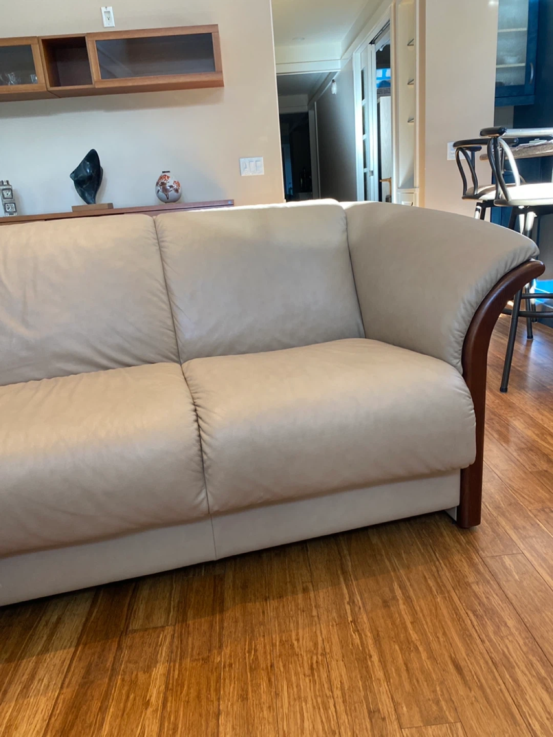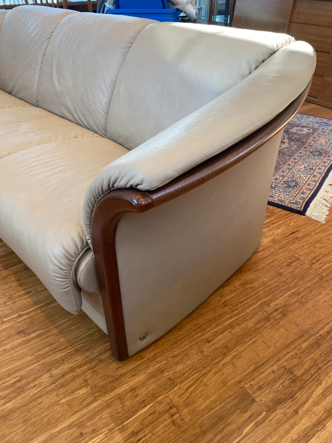Ekornes Collection three-seater sofa. It's upholstered in light beige leather with dark wood trim accents. This sofa offers comfortable seating for any living room.
