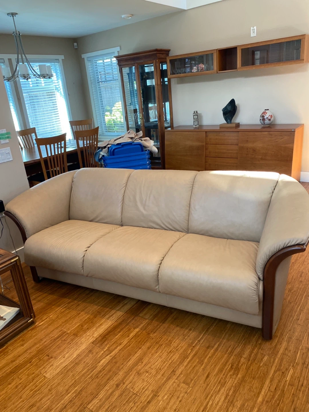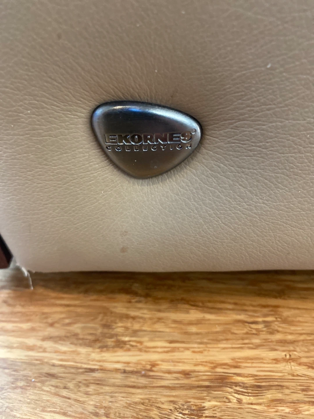 Ekornes Collection three-seater sofa. It's upholstered in light beige leather with dark wood trim accents. This sofa offers comfortable seating for any living room.