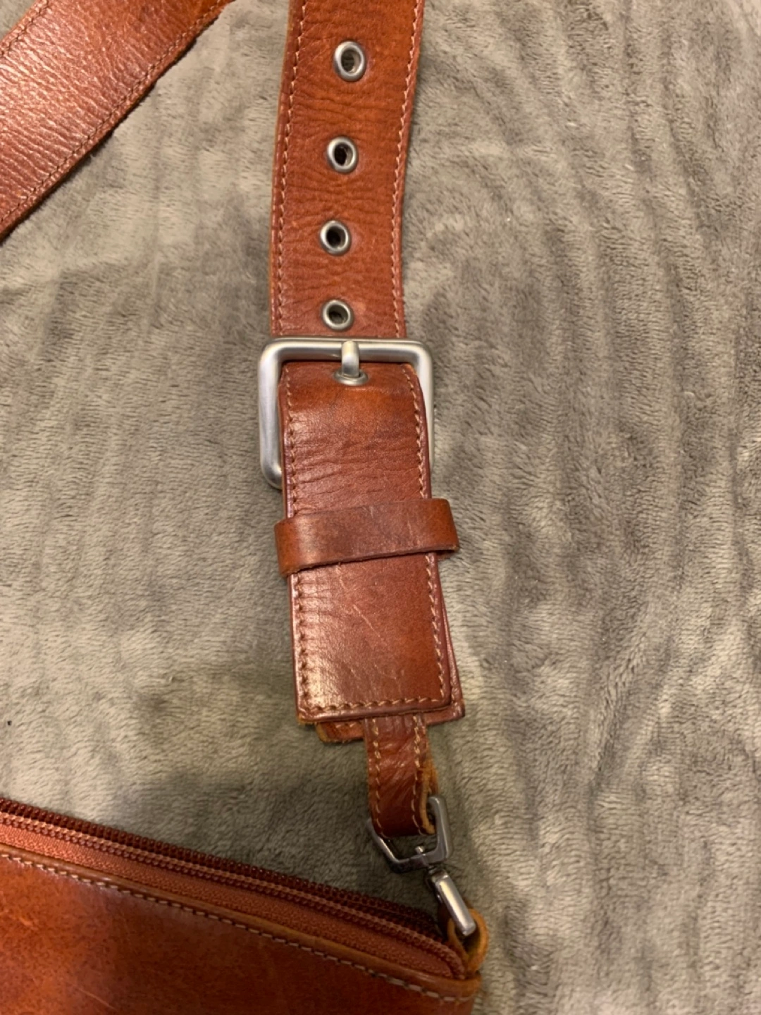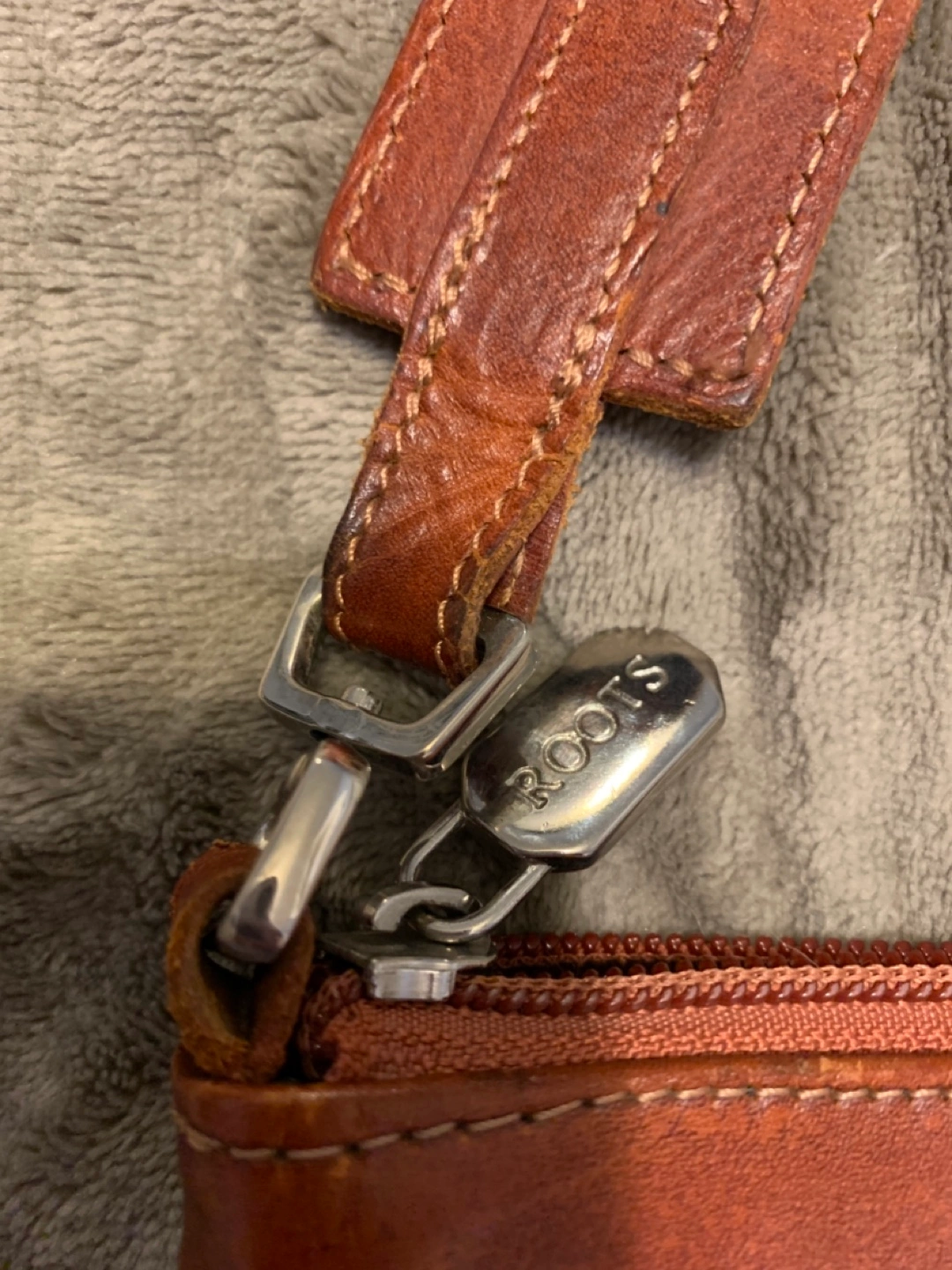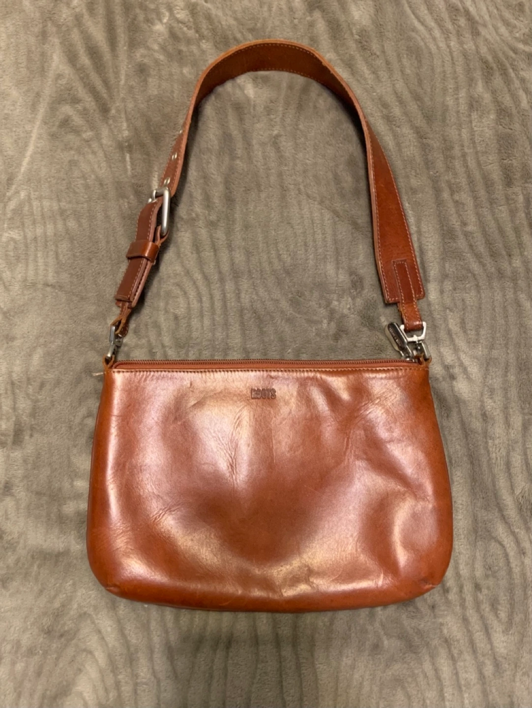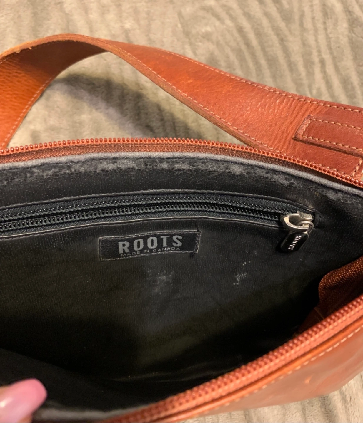 Brown leather shoulder bag. Adjustable strap. Zip closure. Made in Canada. Pre-owned, in excellent condition