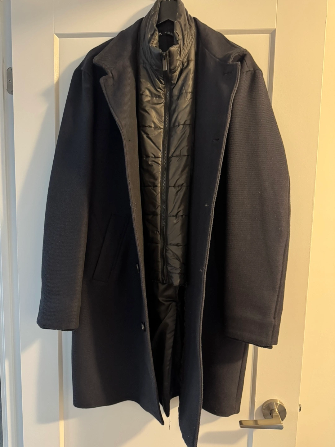 This Zara coat features a classic wool blend outer shell and a detachable quilted vest for extra warmth. It's a size Large,It's great for keeping you warm during colder weather.