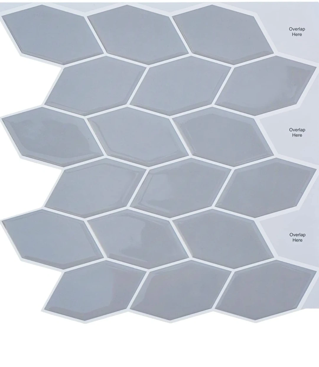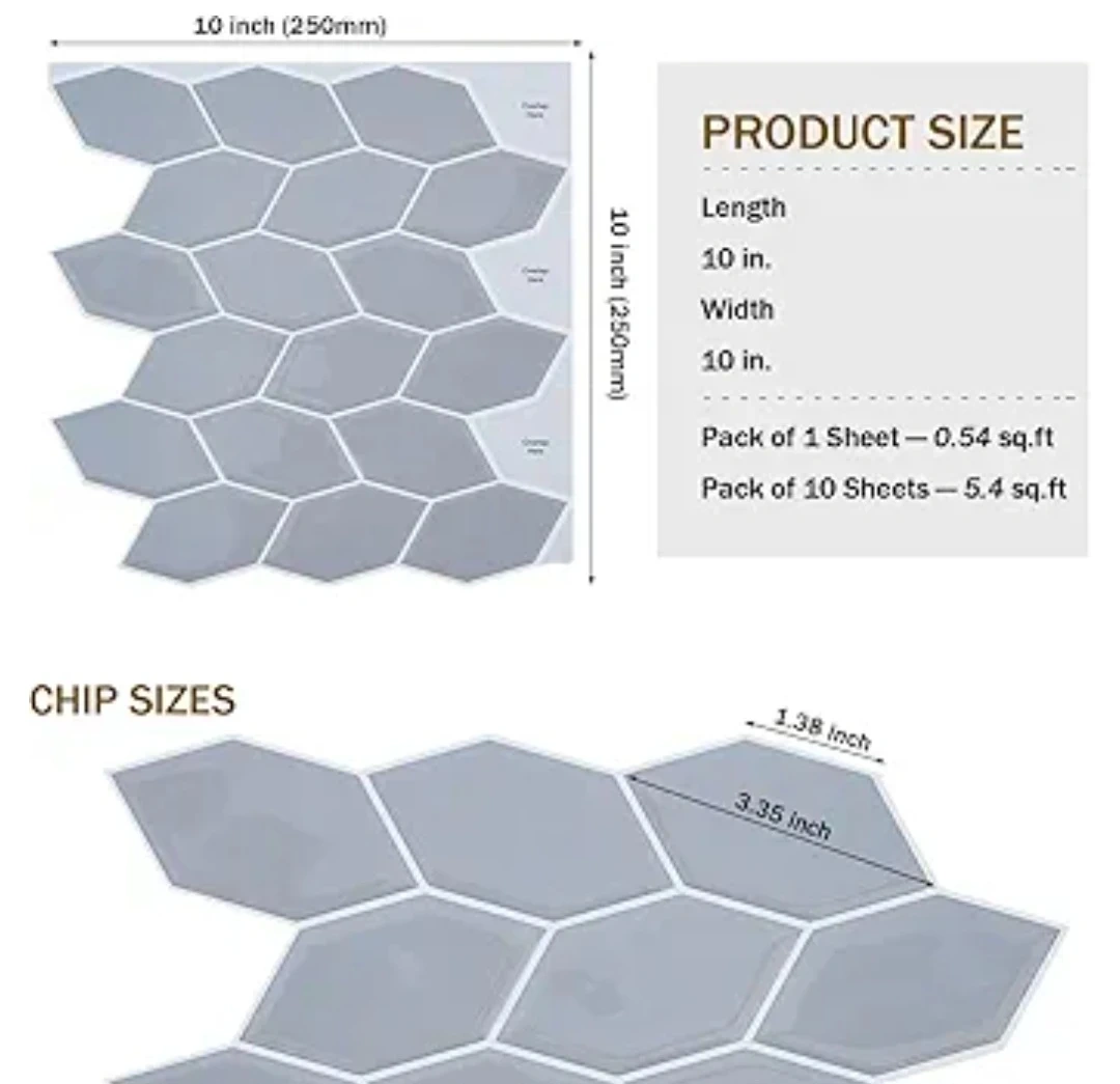 These peel and stick tiles are designed to transform your space. Each sheet is 10 inches by 10 inches. They are easy to apply and can be used on walls. Heat resistant up to 70 degrees Celsius.