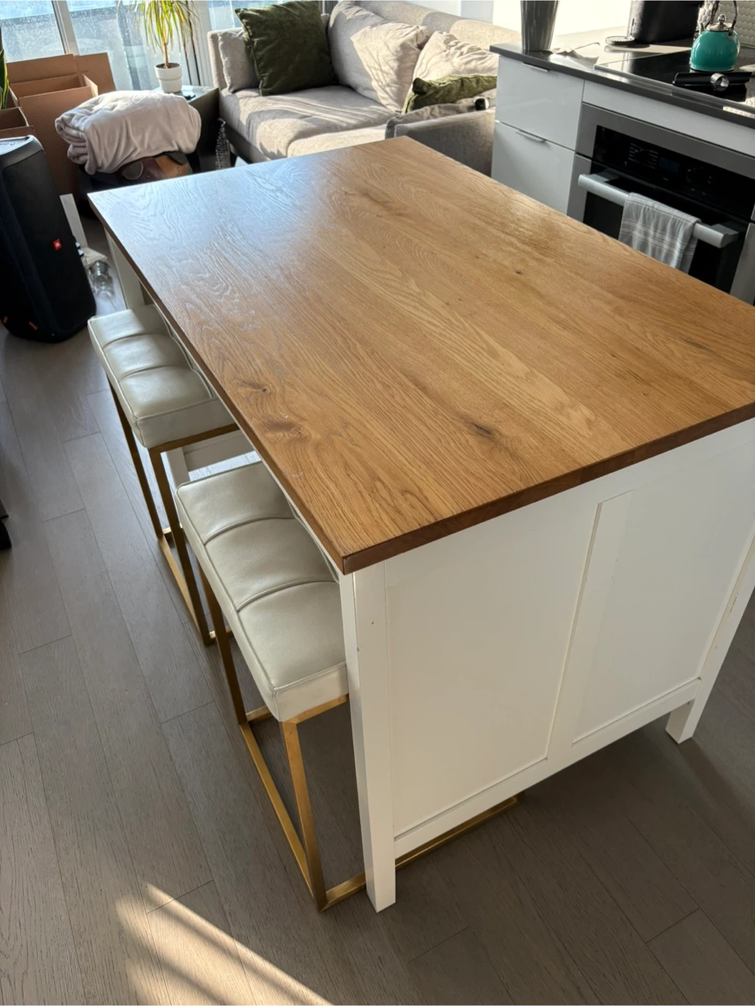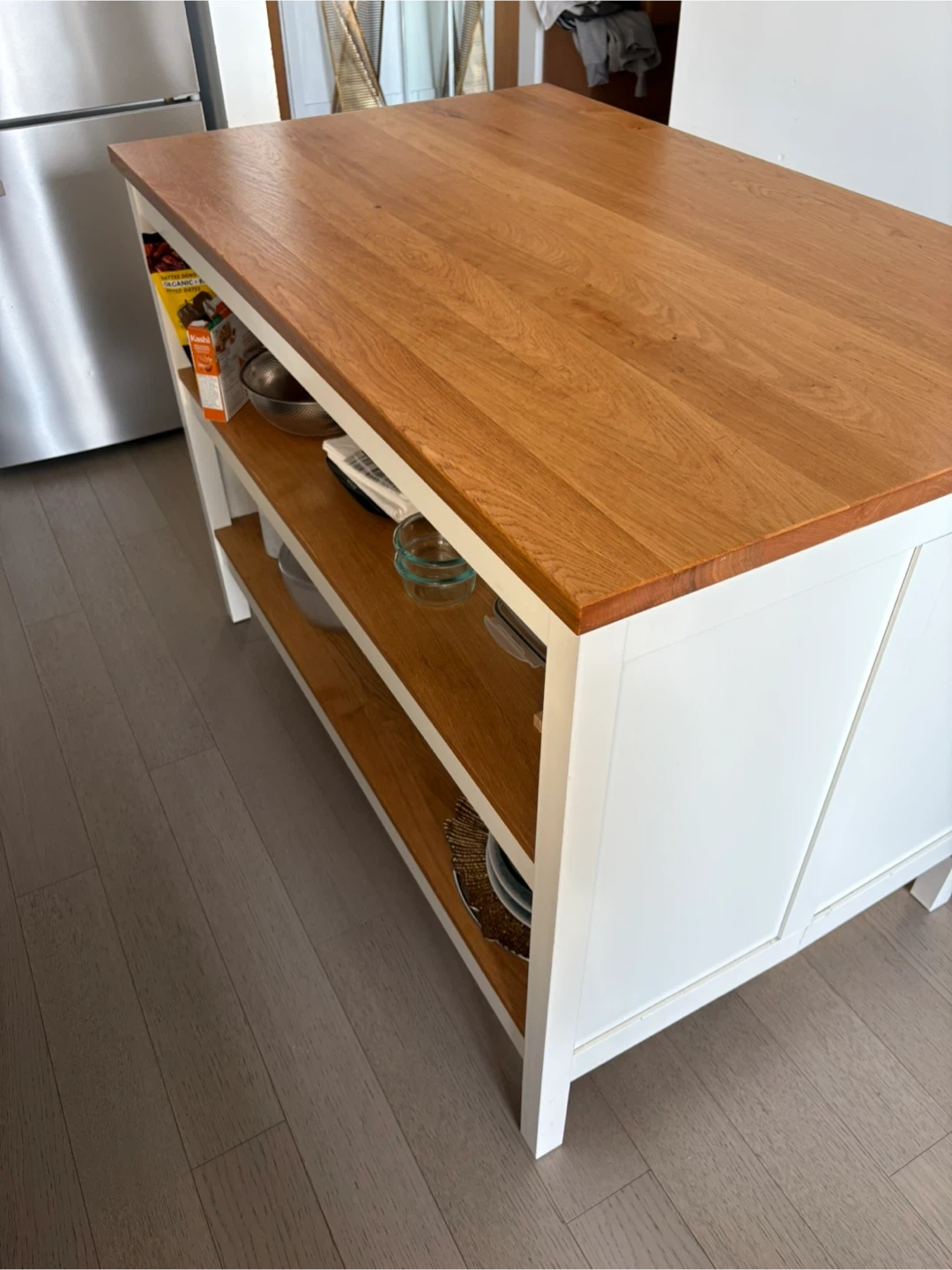 Selling a kitchen island. It has a wooden countertop and a white base. There's also shelving on one side for storage. Perfect for adding extra counter space and seating to your kitchen!