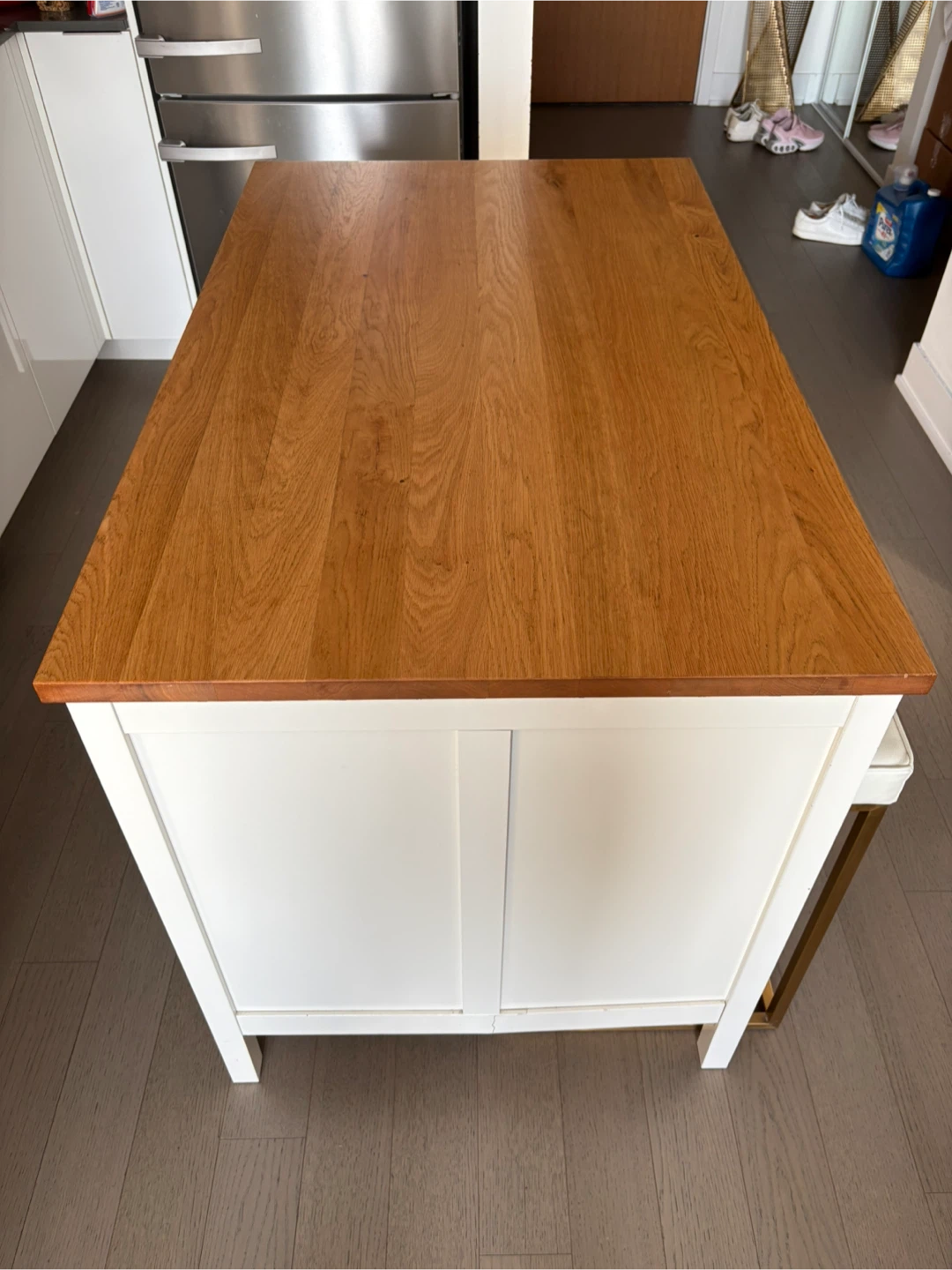 Selling a kitchen island. It has a wooden countertop and a white base. There's also shelving on one side for storage. Perfect for adding extra counter space and seating to your kitchen!