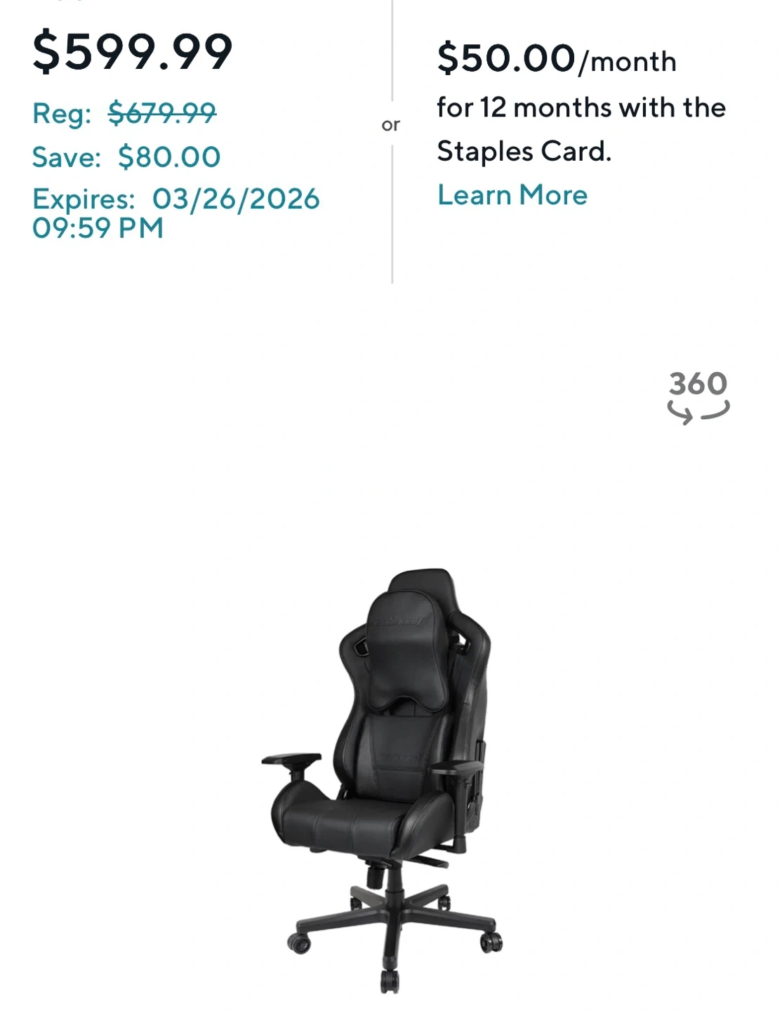 This AndaSeat gaming chair is black and made of faux leather. It comes with a headrest and lumbar pillow for extra support. It's a comfortable chair for long gaming sessions or for your home office setup.