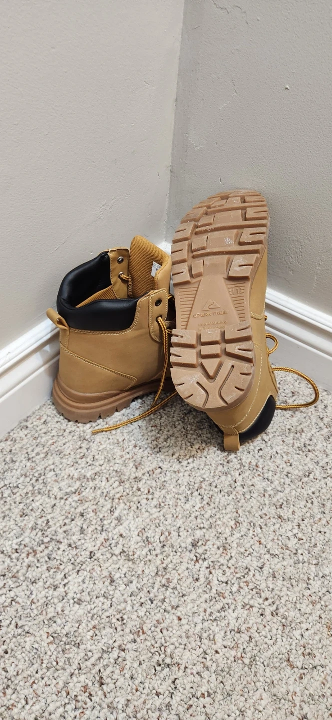 Brand New. Ozark Trail. These tan work boots are a size 11. They're made in China with a durable sole. These boots are suitable for demanding job sites.