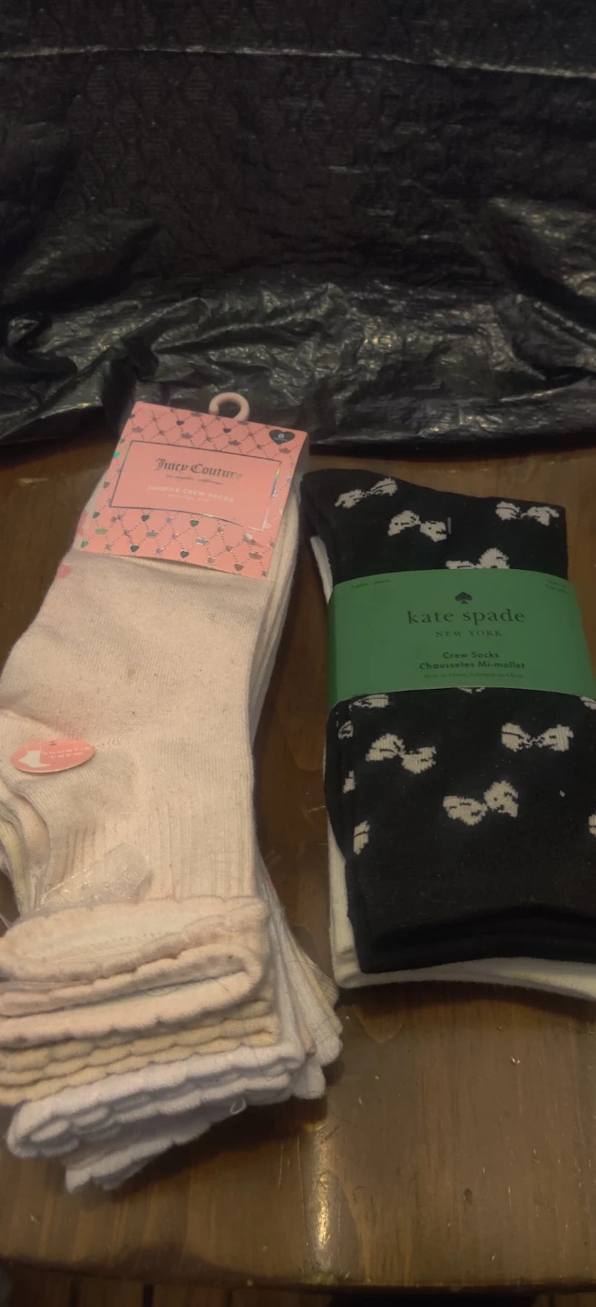 Bundle of Juicy Couture shortie crew socks (shoe size 4-10) and Kate Spade crew socks One size fits most. Both pairs are new with tags.9 pairs altogether.