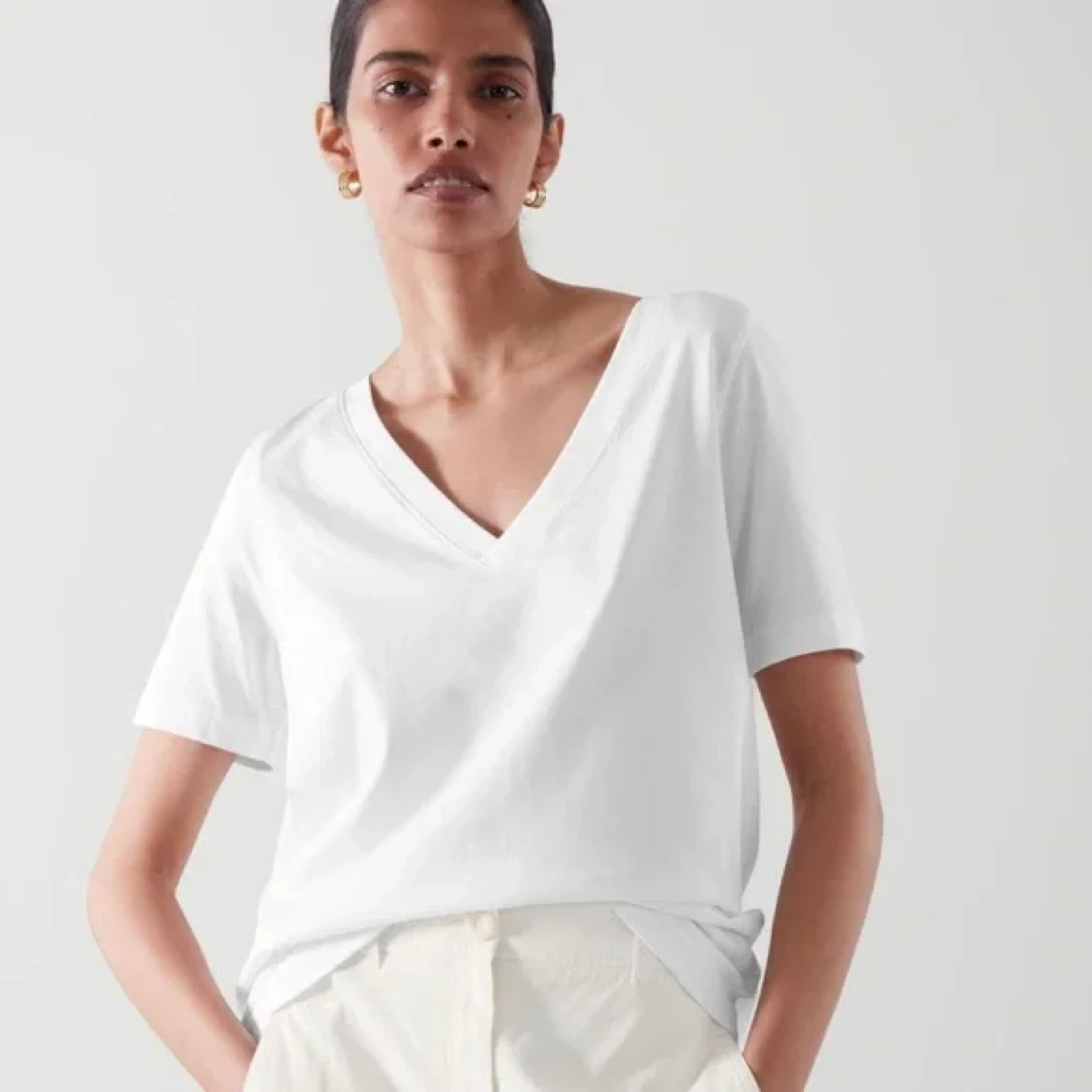 Selling a simple and classic white V-neck T-shirt from COS. It's a size small and in great condition, worn few times.