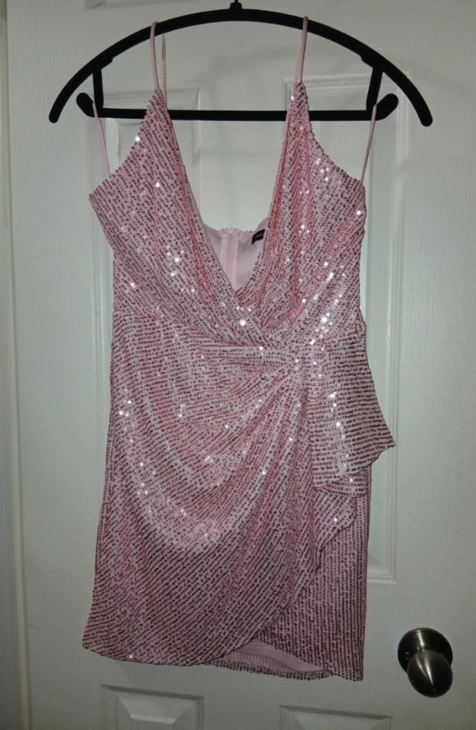 This sparkly sequin dress features flattering ruched details & an asymetric hem. A great choice for a night out or special occasion!