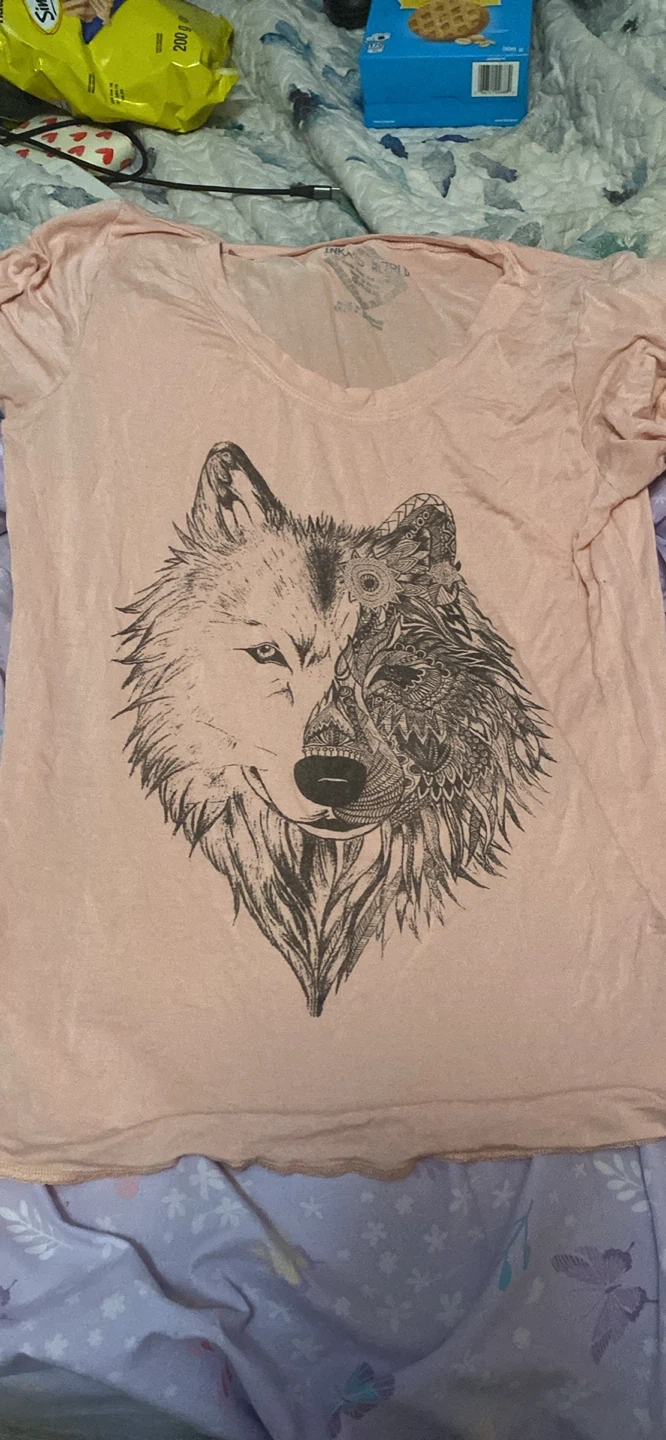 Cute Inka brand T-shirt with a wolf graphic design! It's a light pink colour and in great condition. Perfect for casual wear or layering, it adds a touch of personality to any outfit