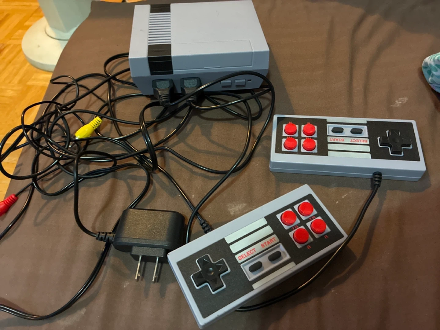 a classic Nintendo NES console! It comes with two controllers and all the necessary cables to hook it up and start playing. Perfect for reliving those retro gaming memories!