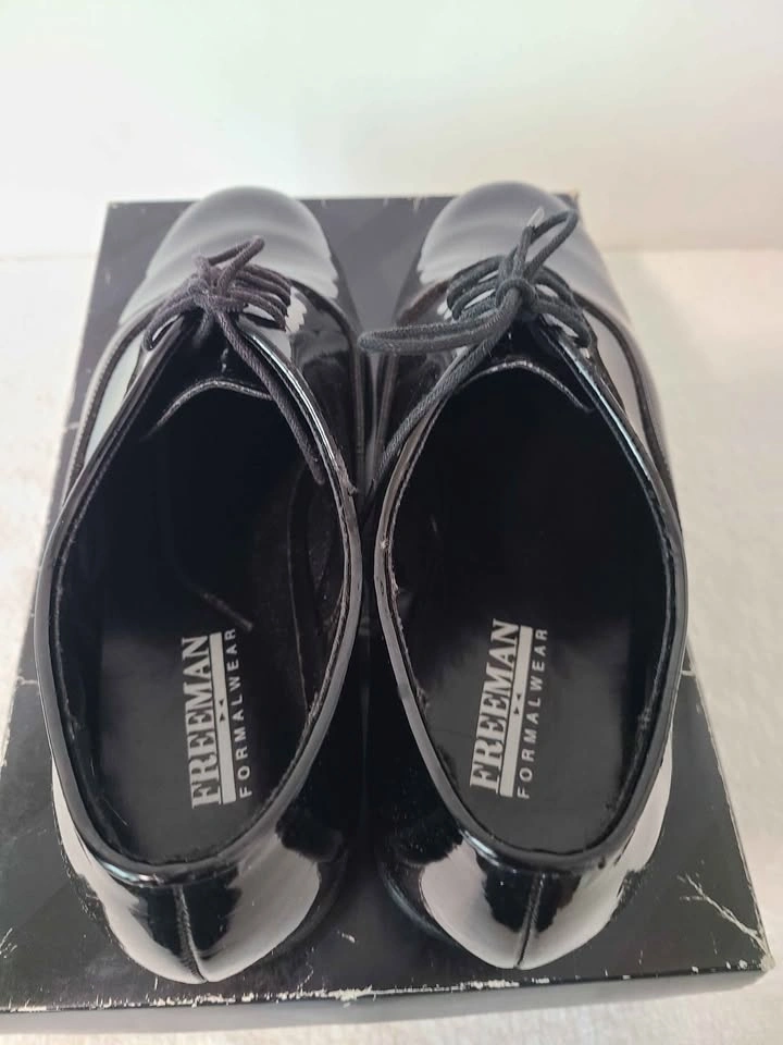 Shiny black patent leather formal shoes. Freeman Formalwear brand. Size 9M. Great for any formal event or tuxedo outfit.