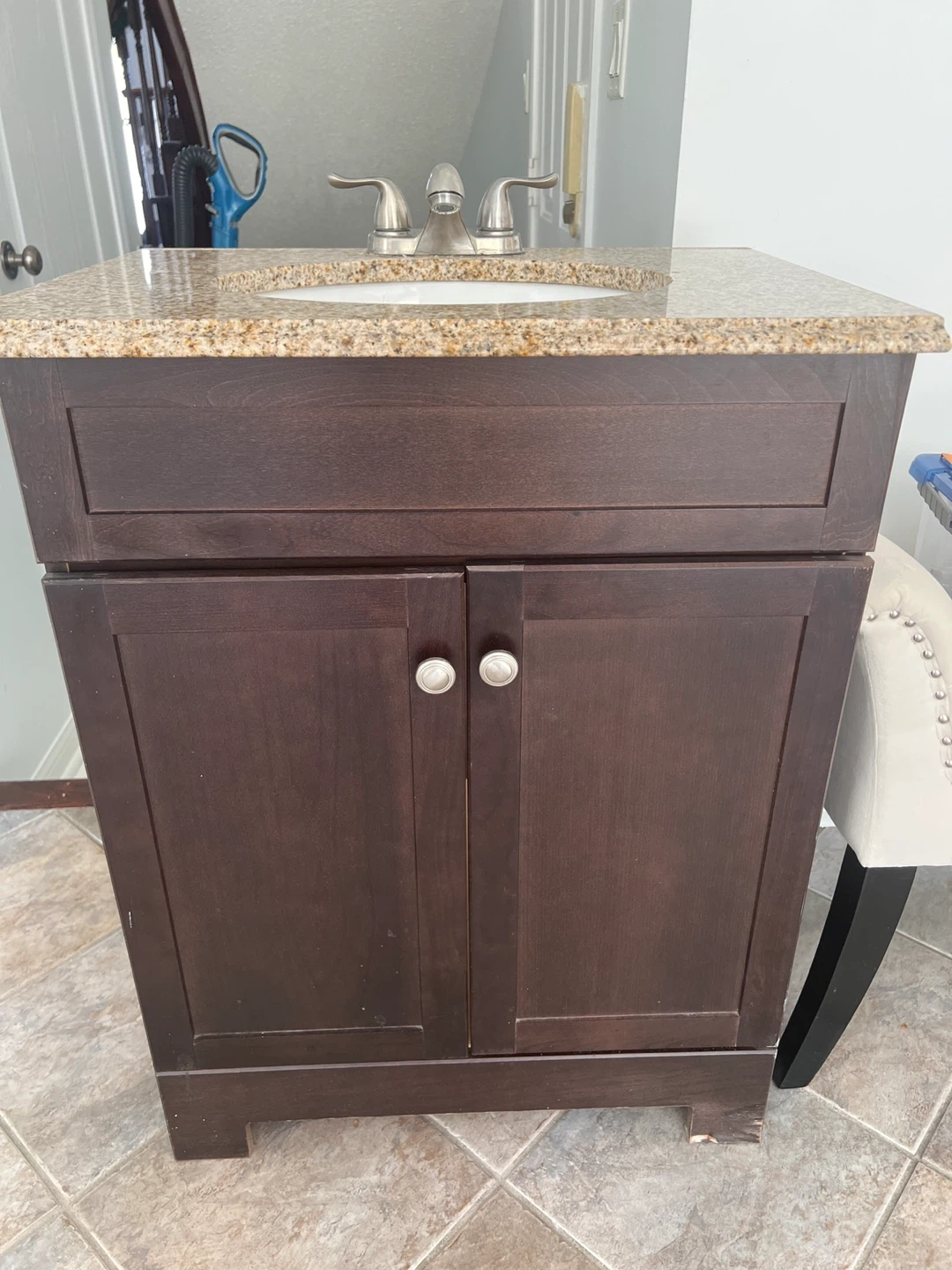 This is a dark wood bathroom vanity with a granite countertop and a white sink. It features two cabinet doors for storage. The top is speckled granite.