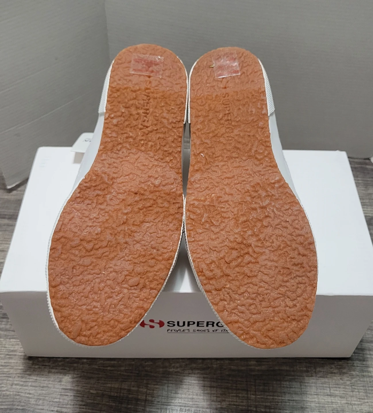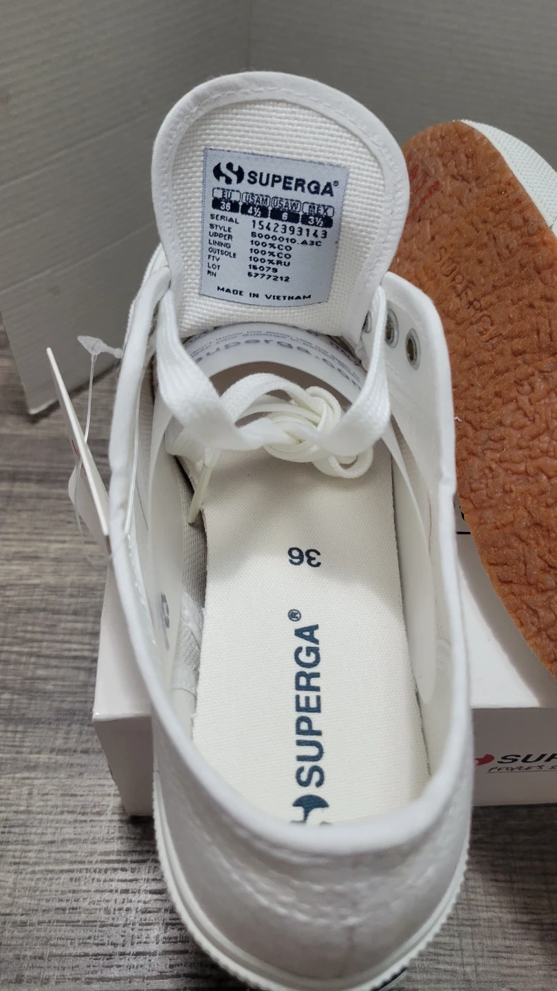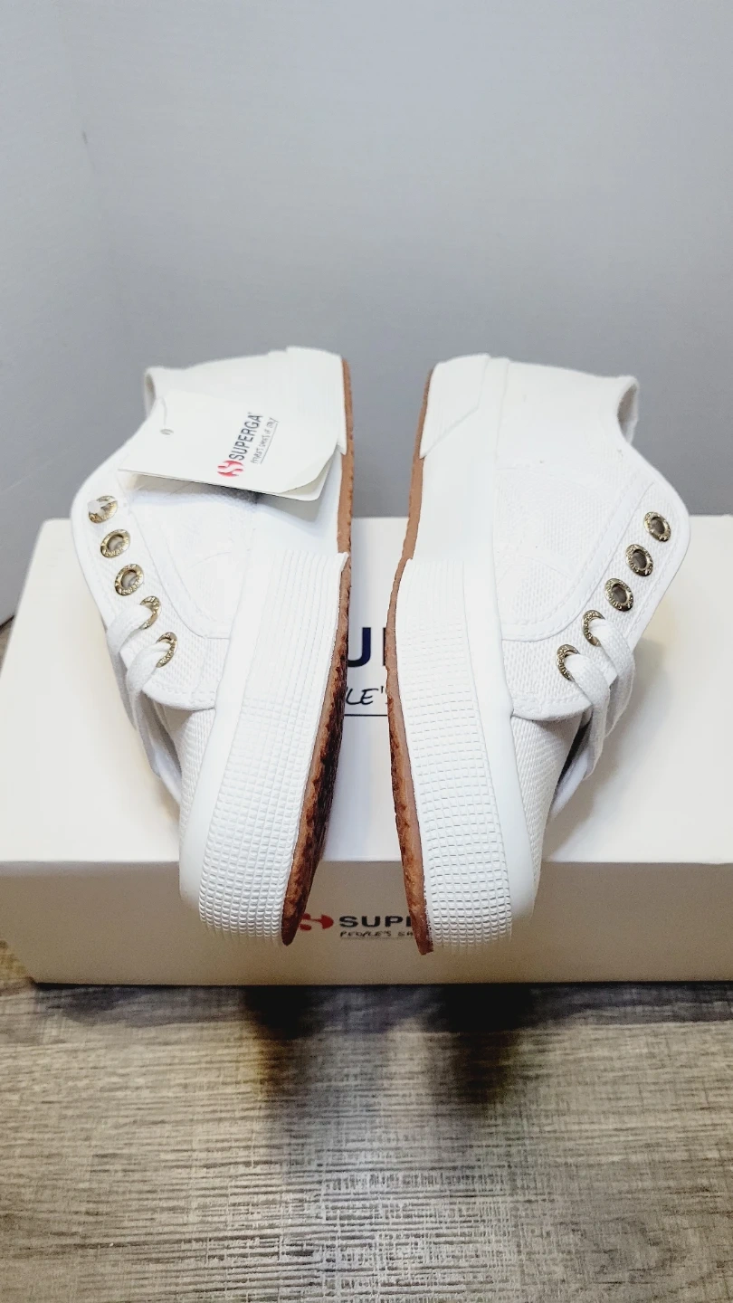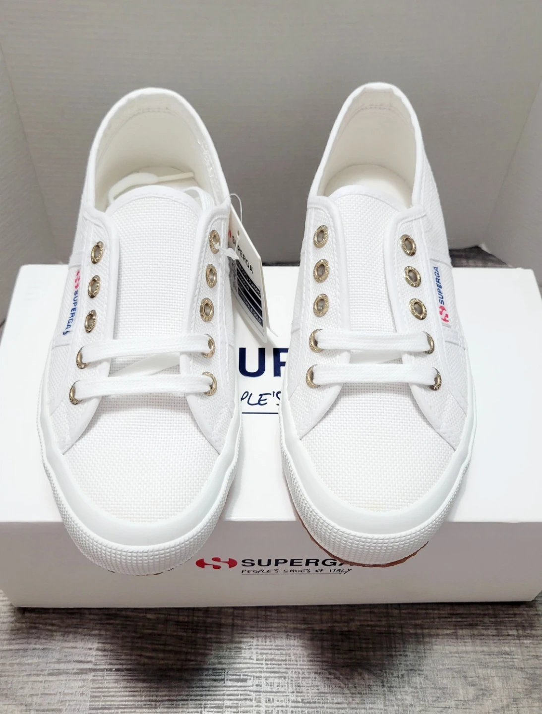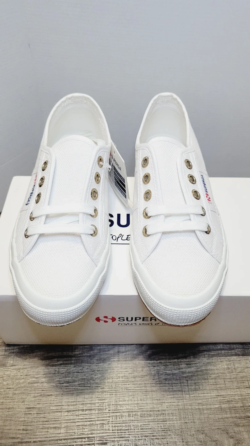 Superga women's white canvas low top sneakers. Classic lace-up design with gold-tone eyelets. Includes original Superga box.