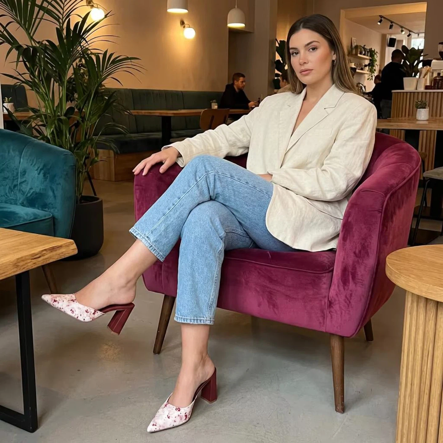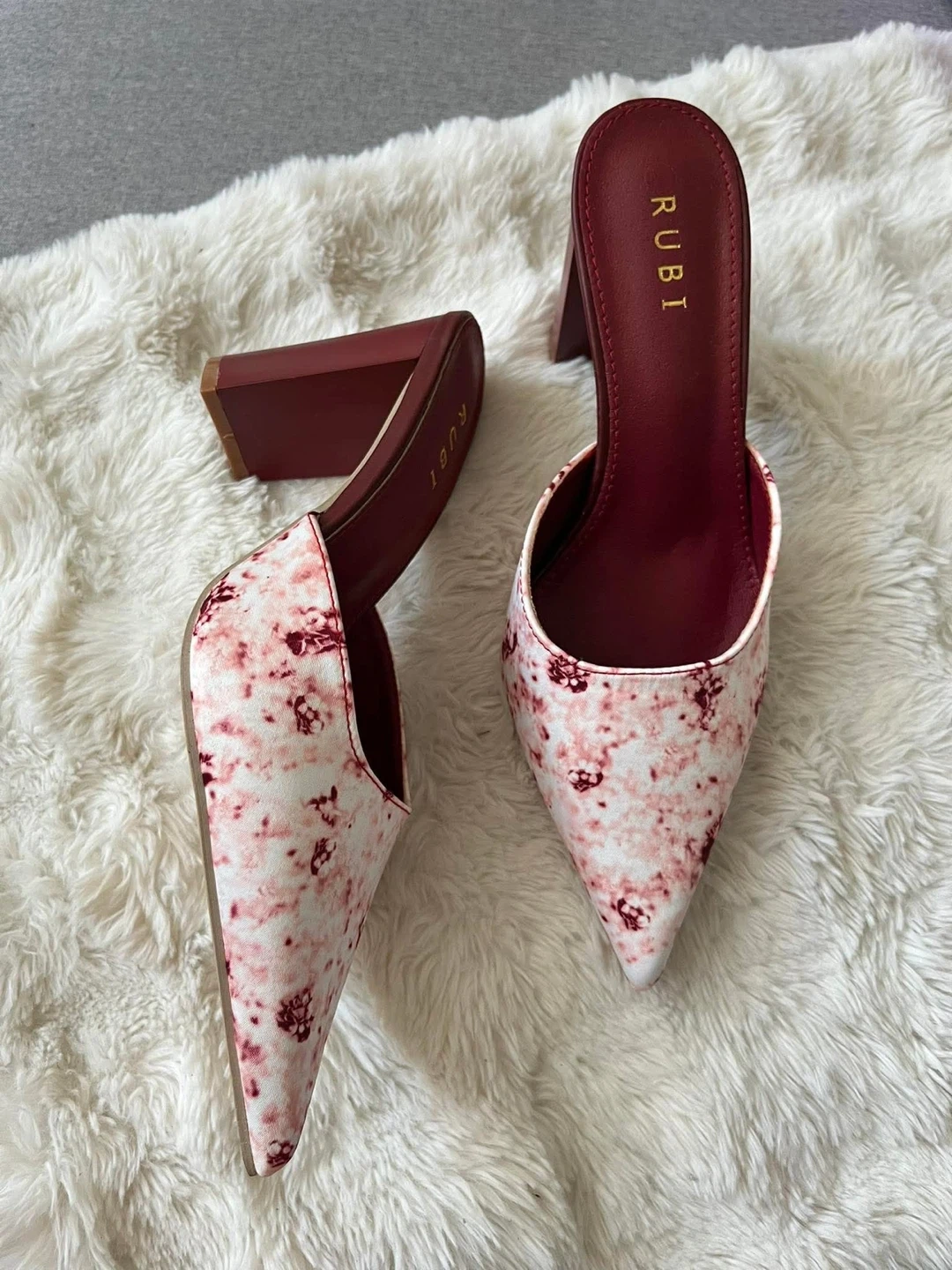 Stylish Rubi heeled mules with a delicate pink and white floral print. These slip-on shoes feature a pointed toe and a sturdy block heel. Perfect for adding a touch of elegance to any outfit!