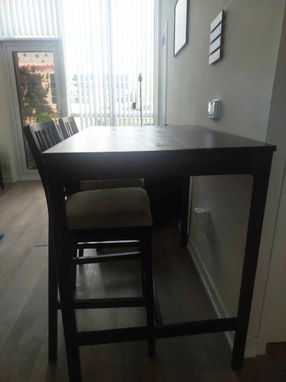 Selling a dark brown high dining table with two matching chairs. It's a great set for a smaller dining space or kitchen nook. The chairs have a neutral-toned fabric seat. It does show some wear and tear on the seats done by our cats, as pictured. owned for 1 year only.