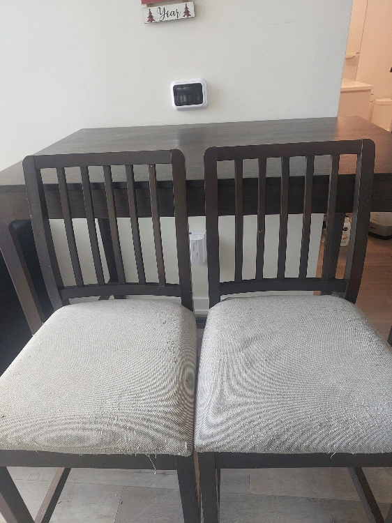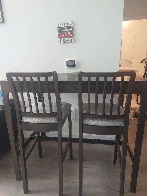 Selling a dark brown high dining table with two matching chairs. It's a great set for a smaller dining space or kitchen nook. The chairs have a neutral-toned fabric seat. It does show some wear and tear on the seats done by our cats, as pictured. owned for 1 year only.
