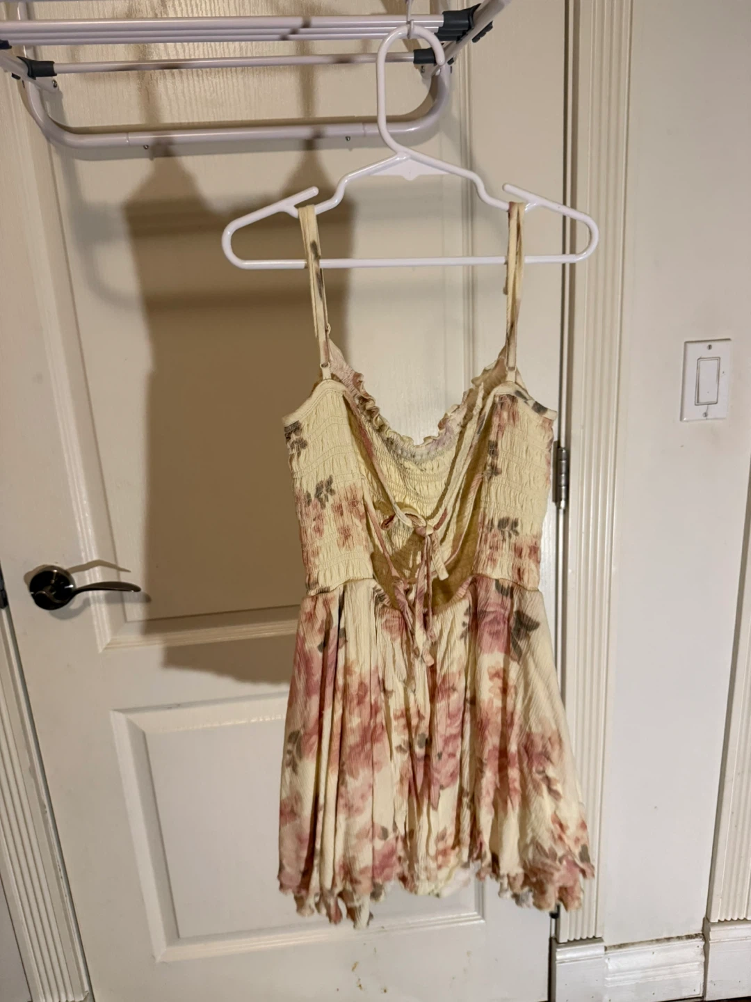 Cream coloured mini dress with a yellow base and a delicate pink floral print. It features a smocked bodice with adjustable spaghetti straps and a tie detail at the back. The skirt is flowy and gathered.