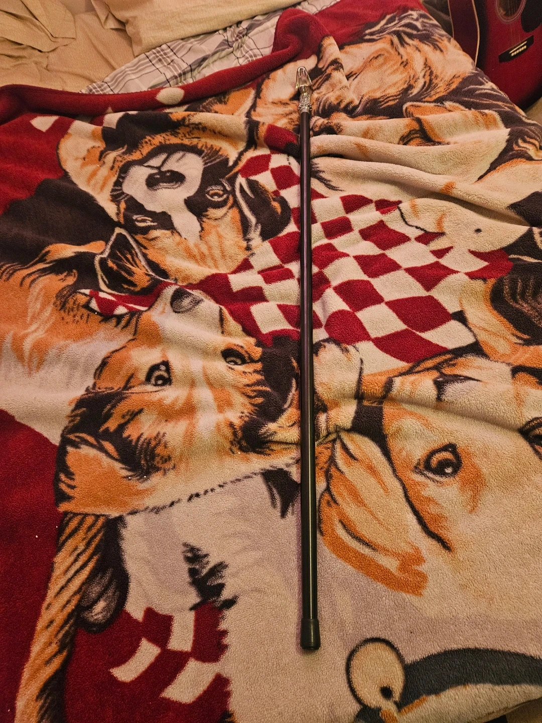 This walking cane features a decorative snake head handle with a blue gem eye. The shaft is black and appears to be made of metal. It's a unique accessory for costume or display.