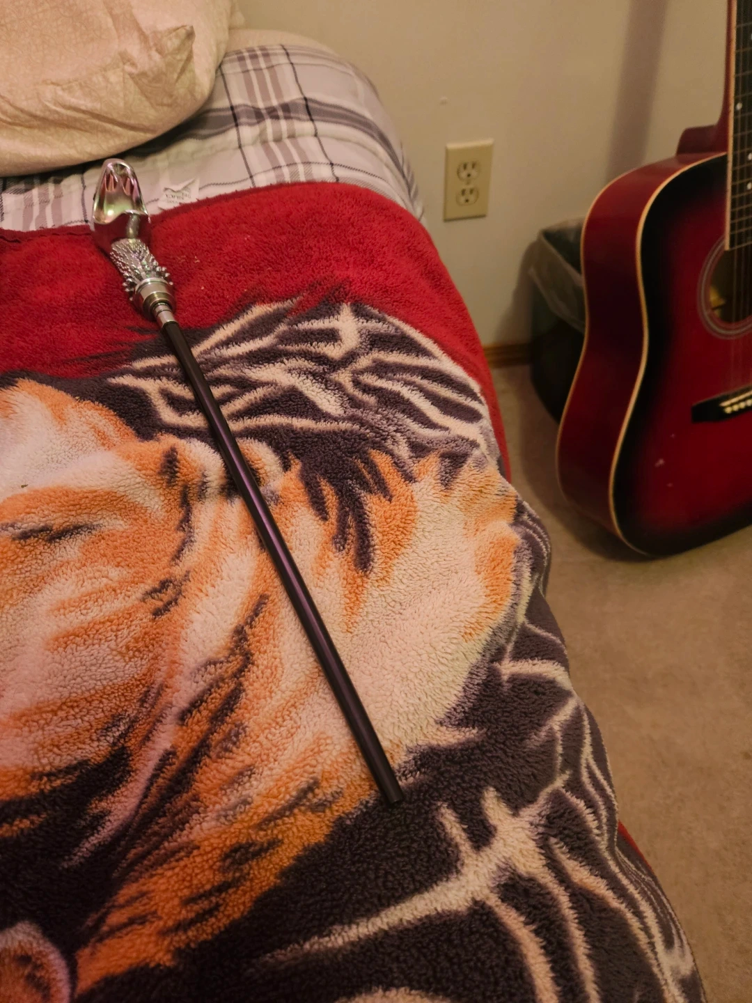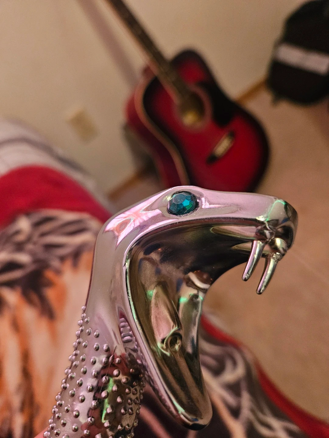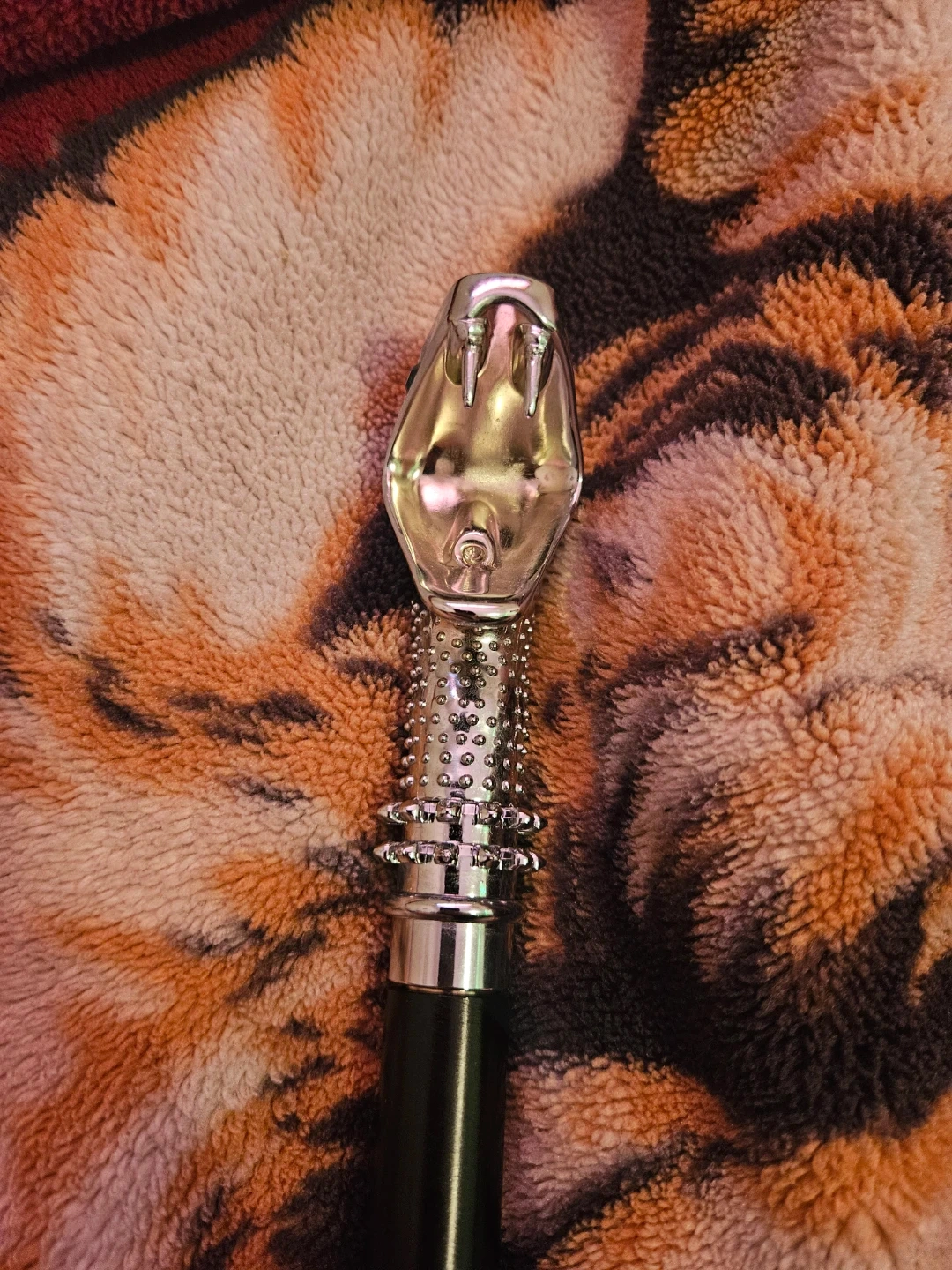 This walking cane features a decorative snake head handle with a blue gem eye. The shaft is black and appears to be made of metal. It's a unique accessory for costume or display.