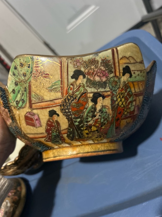 This is an exquisite antique Japanese bowl and lidded container set, showcasing intricate hand-painted designs and gold accents. The bowl features a detailed scene with figures in traditional Japanese attire, while the lidded container complements it with matching ornate patterns. This set is used, but in good condition, with some minor wear that is consistent with its age, adding to its vintage charm. Unfortunately, the bowl has a small crack in the side but is still intact. These pieces are perfect for collectors or anyone looking to add a touch of elegance to their home. Pick up in Everett or possibly delivery to North End Barrie.