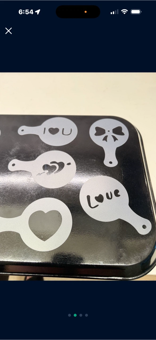 Condition New- includes 16 different fun designs for decorating lattes and cappuccinos. Designs include a sun, moon, stars, coffee beans, hearts, smiley faces, and more. Made of durable material for repeated use. Perfect for home baristas and coffee lovers!