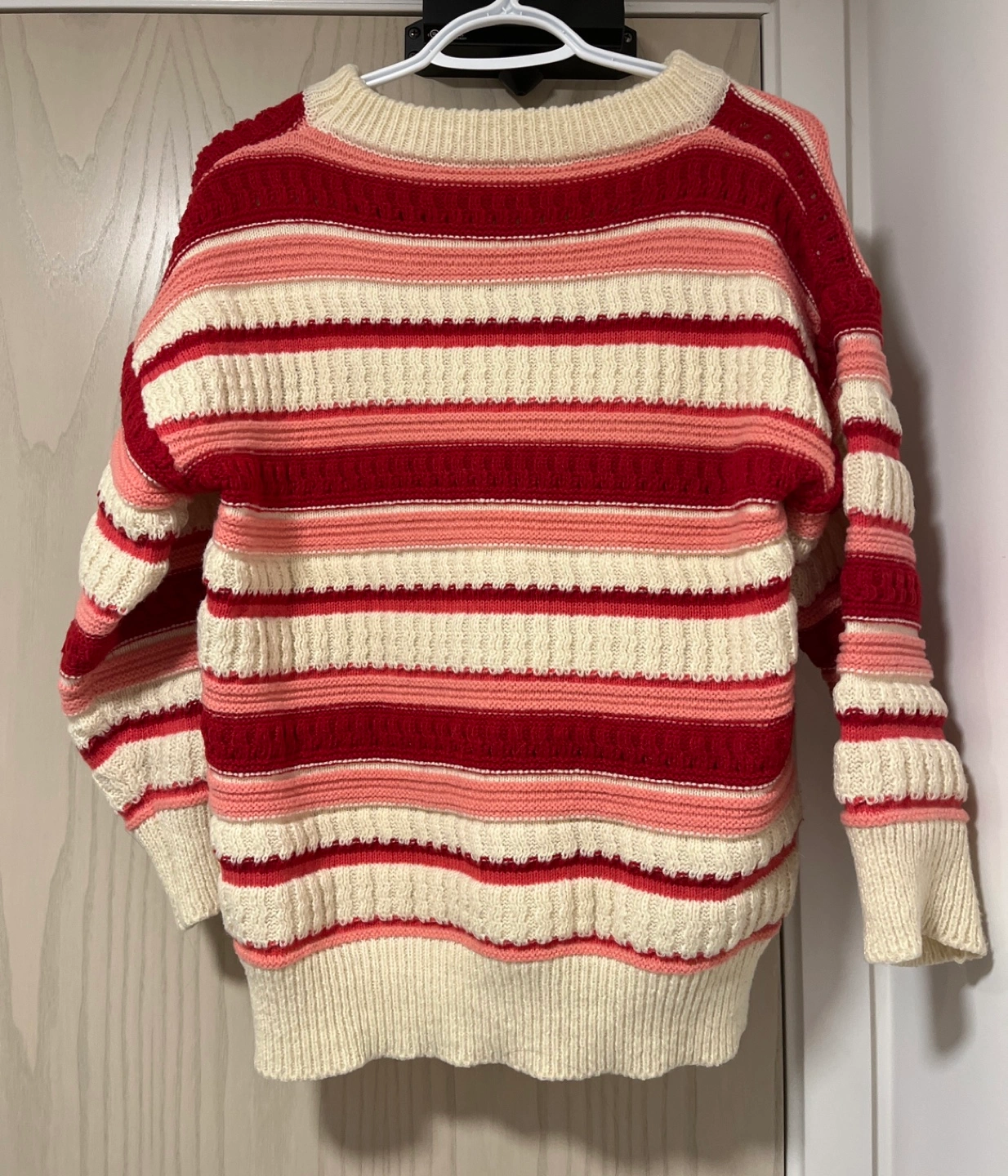 Women's horizontally striped knit sweater. Cream, pink and red colours. Three-quarter sleeves. Relaxed fit. Crew neck. Perfect condition only worn once. Not my style anymore