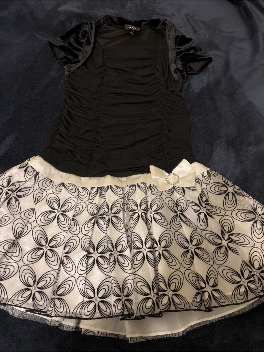 This BCXgirl dress features a ruched black bodice with velvet trim on the sleeves and neckline. The skirt is black and white with a floral pattern. Size 16. It's perfect for parties or special occasions!