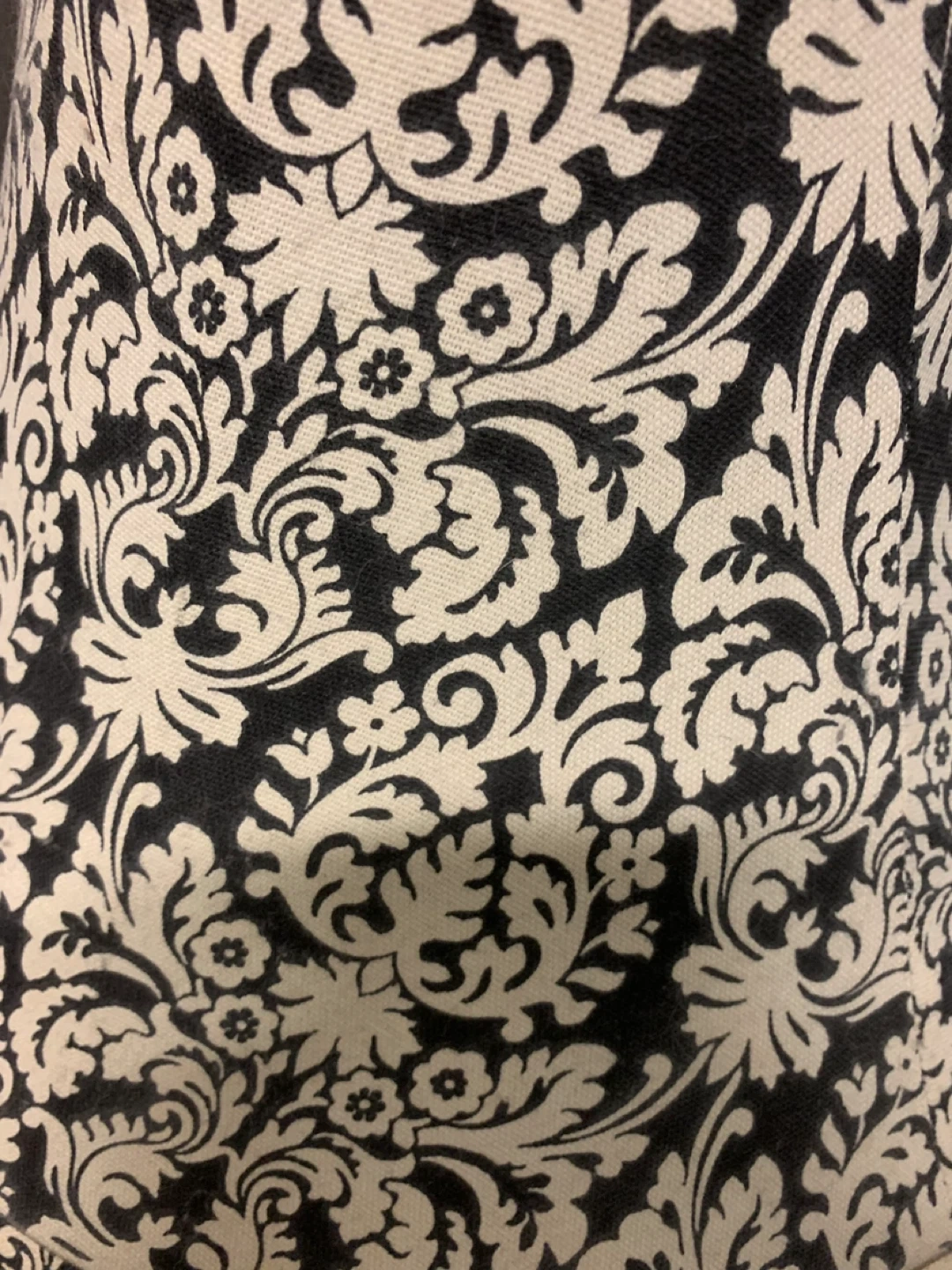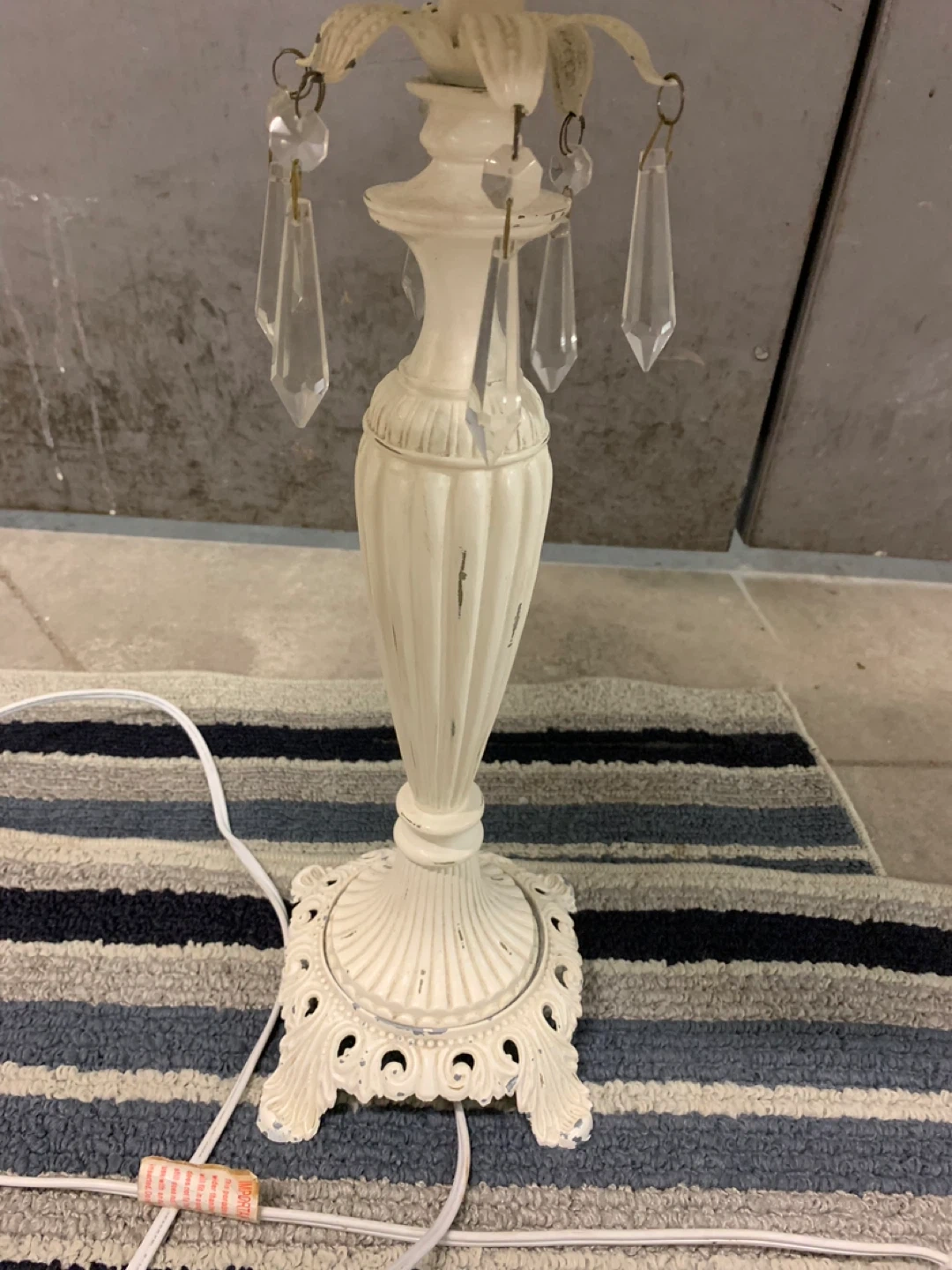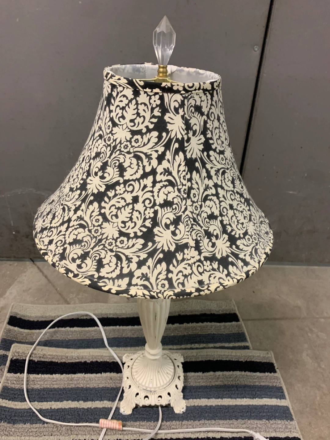 This decorative table lamp features a vintage-inspired white base and a black and white damask patterned shade. It has a classic look with faux crystal accents. The lamp is perfect for adding a touch of elegance to any room. Stands 32 inches tall…