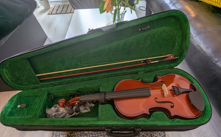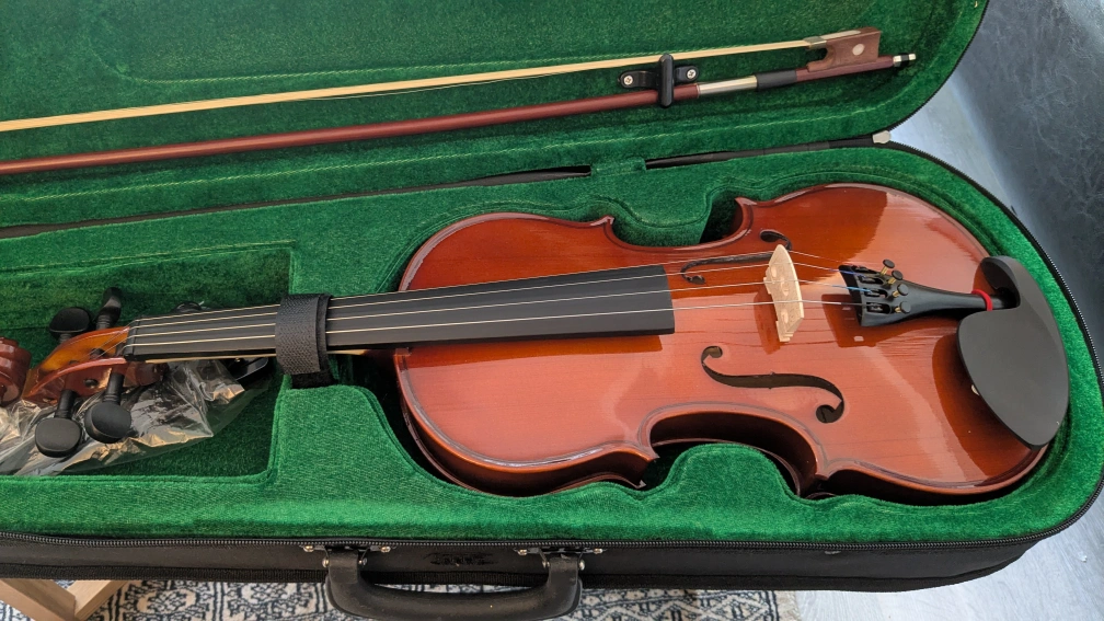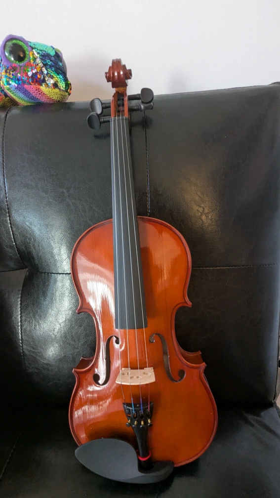 Beginner violin, great for students. Includes a bow, case, and clip-on tuner. Rarely used, Ready to play.
