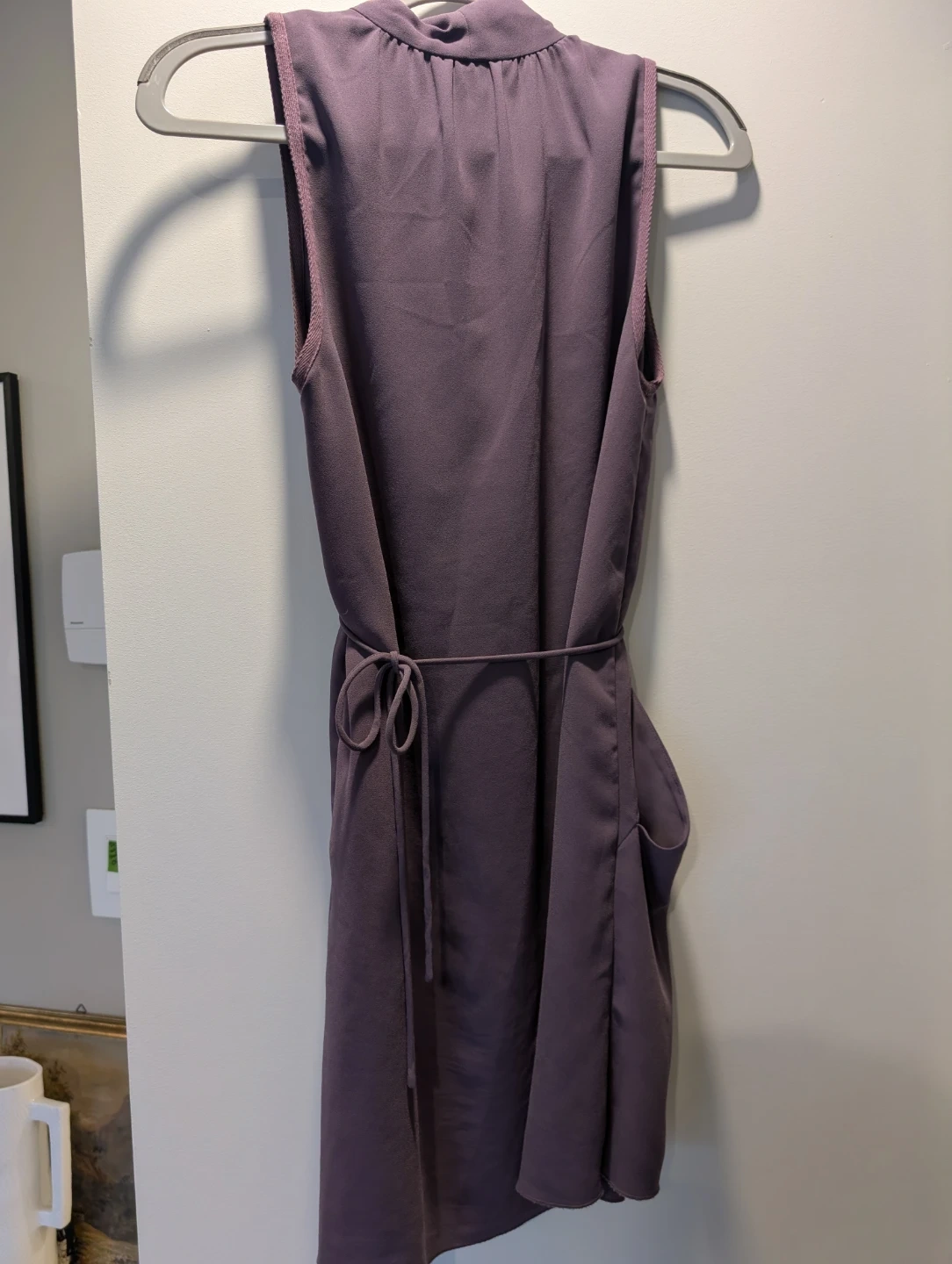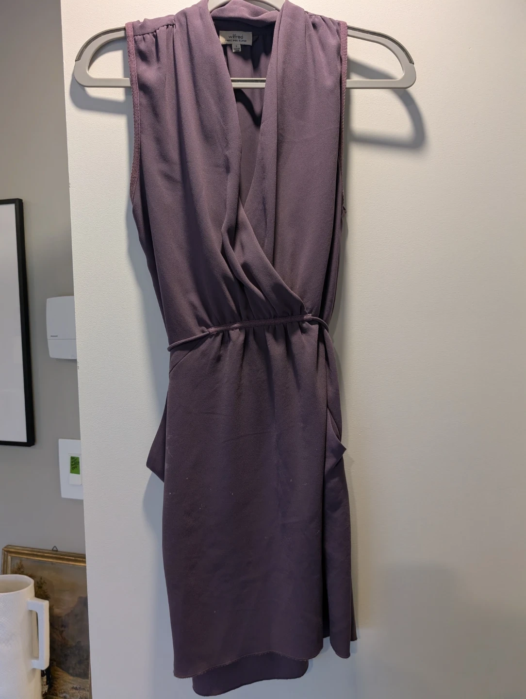 This Wilfred sleeveless wrap dress comes in a lovely shade of purple. It's a size small and features a tie waist. The fabric is made in Japan.