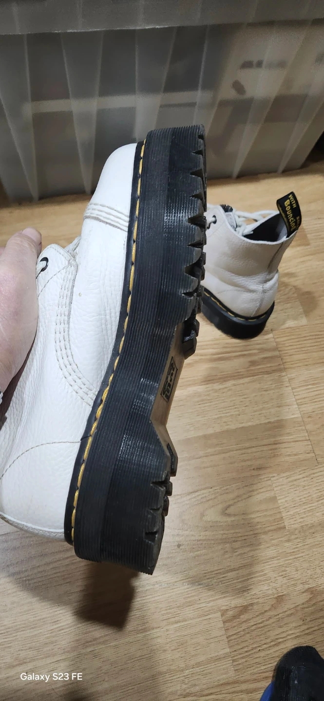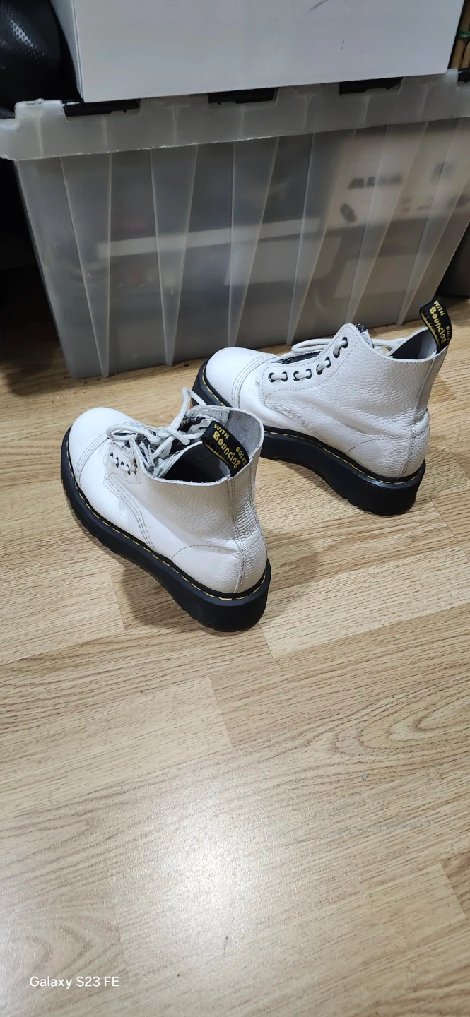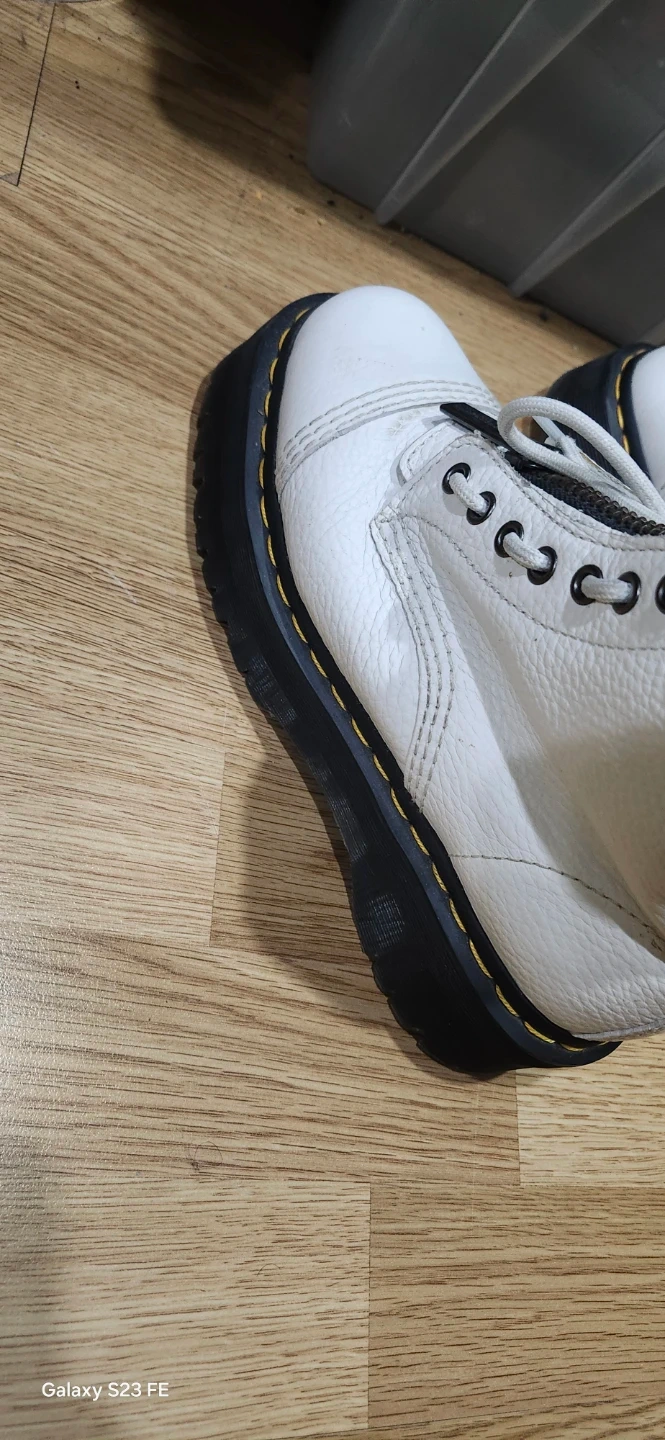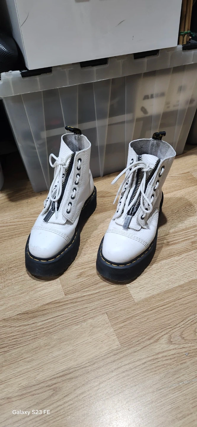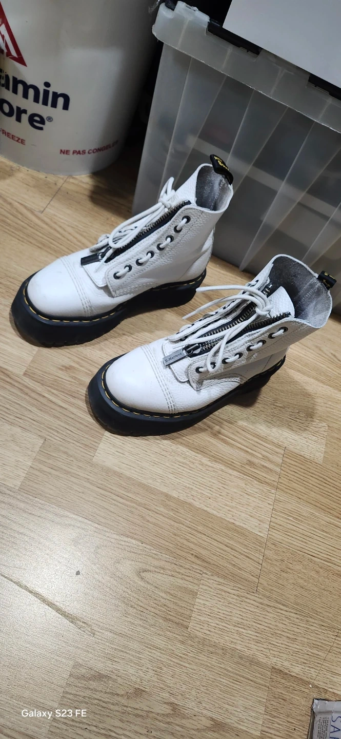 Used excellent condition Selling a pair of Dr. Martens boots in white leather. They feature a unique zipper detail and a chunky platform sole. These boots are in great condition and ready for a new adventure! Price firm final cash only pickup no delivery 891 O'Connor drive outside TD Canada Trust bank door East York.