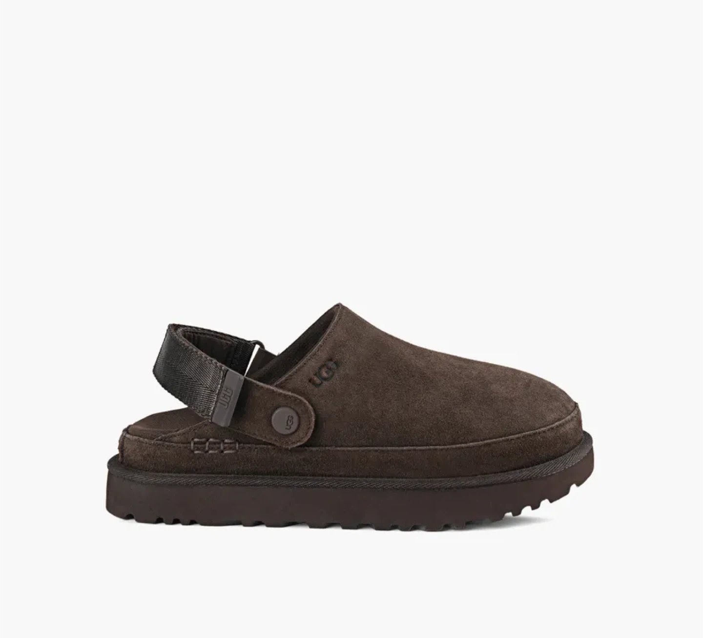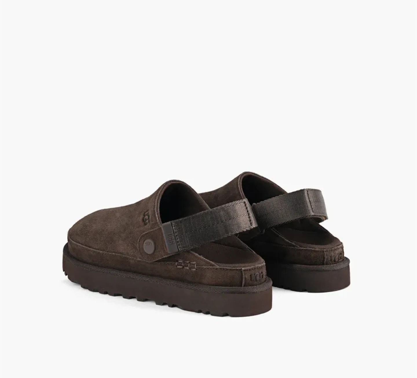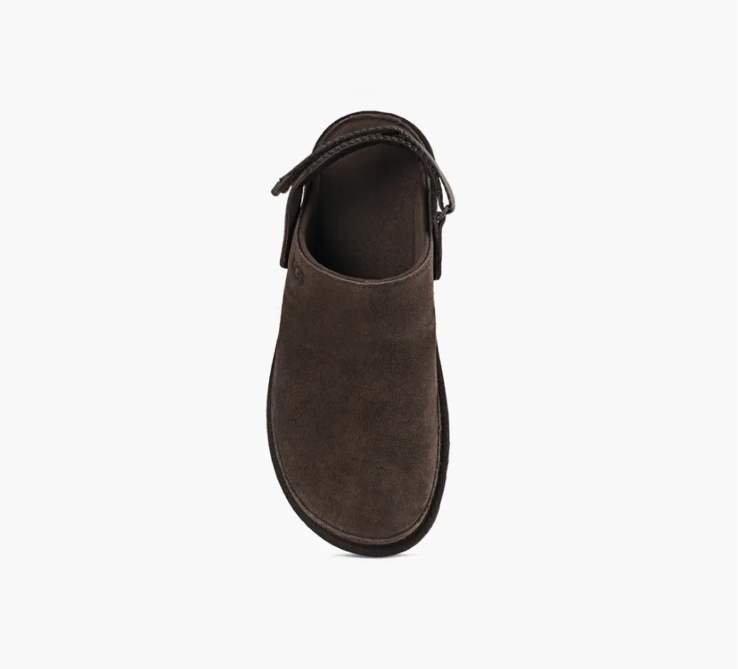 These UGG Tasman X slide clogs are made from rich brown suede. They feature a comfortable slip-on design with a versatile strap that can be worn up or down. Great for indoor or outdoor wear!