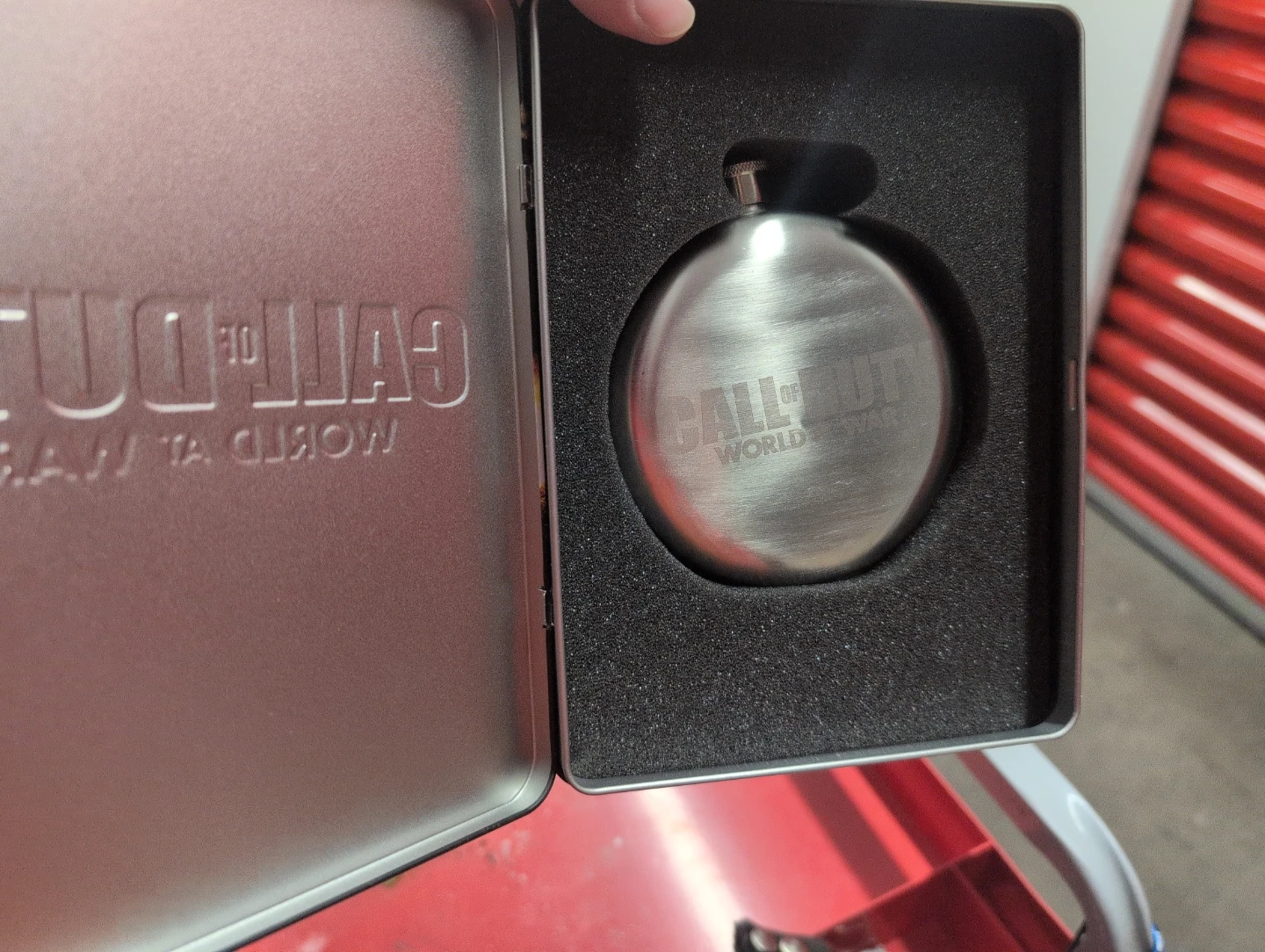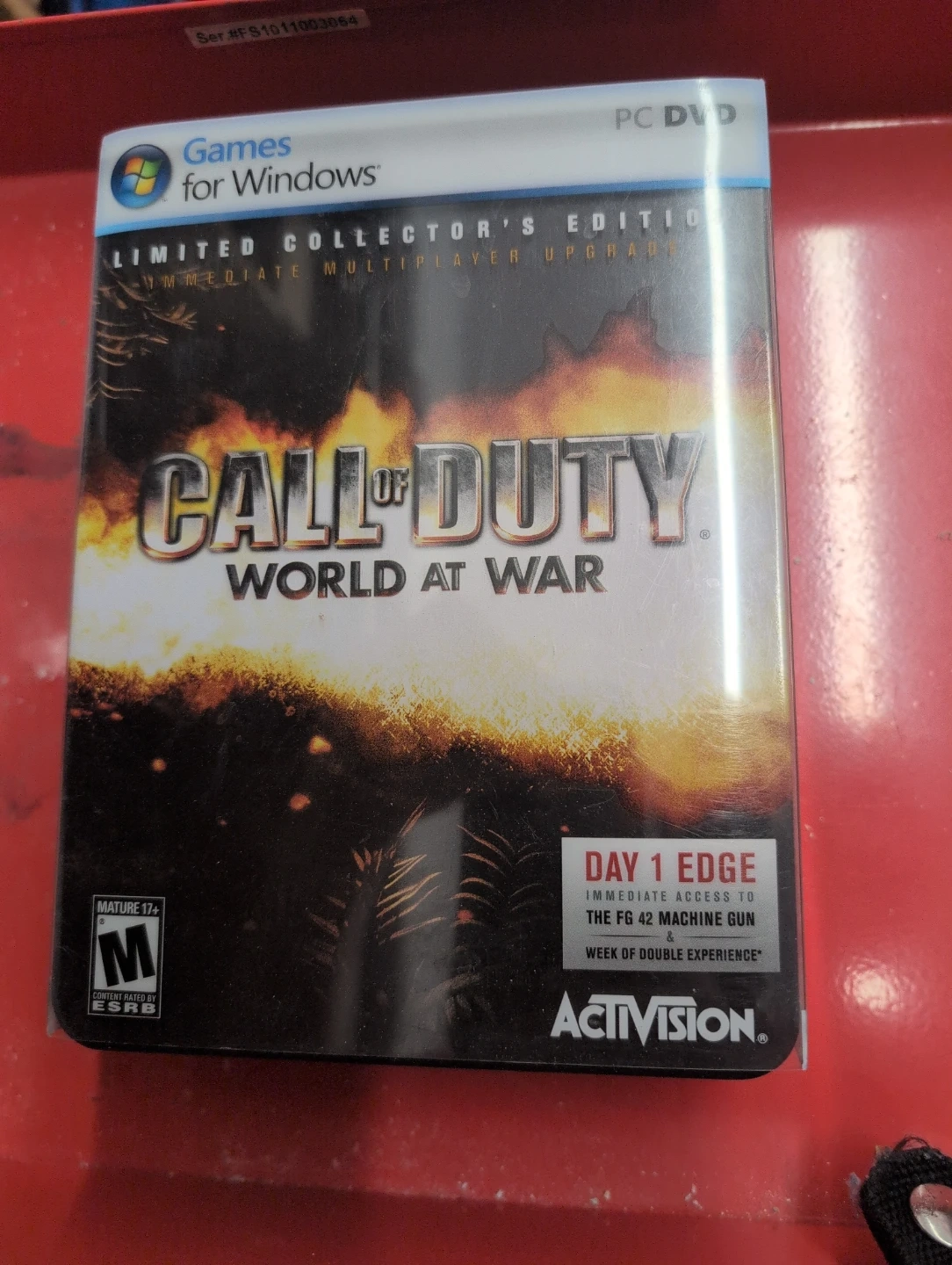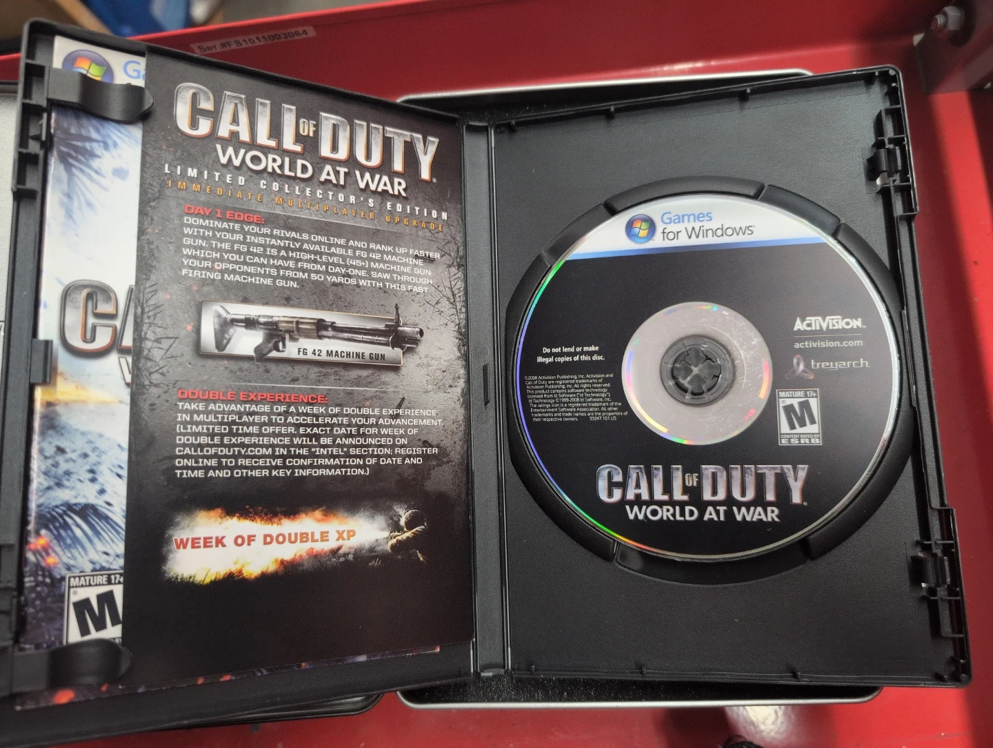 This is the Call of Duty: World at War Limited Collector's Edition for PC. It includes immediate multiplayer upgrades like the FG 42 Machine Gun and a week of double experience. The set also comes with a branded stainless steel flask.