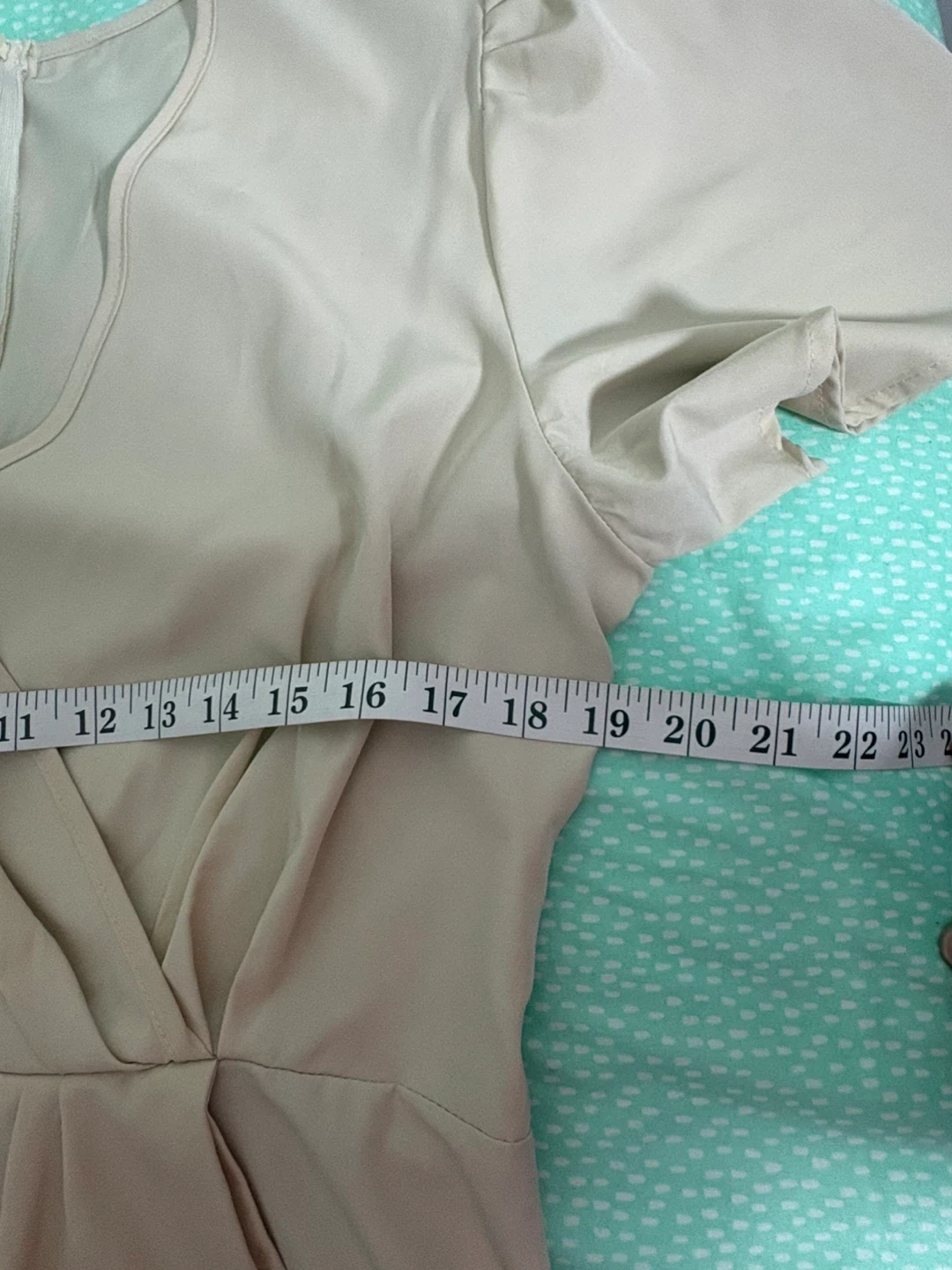 This beige faux leather wrap dress features short flutter sleeves and a flattering V-neckline. It's designed with a tulip hem and a faux wrap skirt for a stylish silhouette. The material's smooth finish offers a chic look.